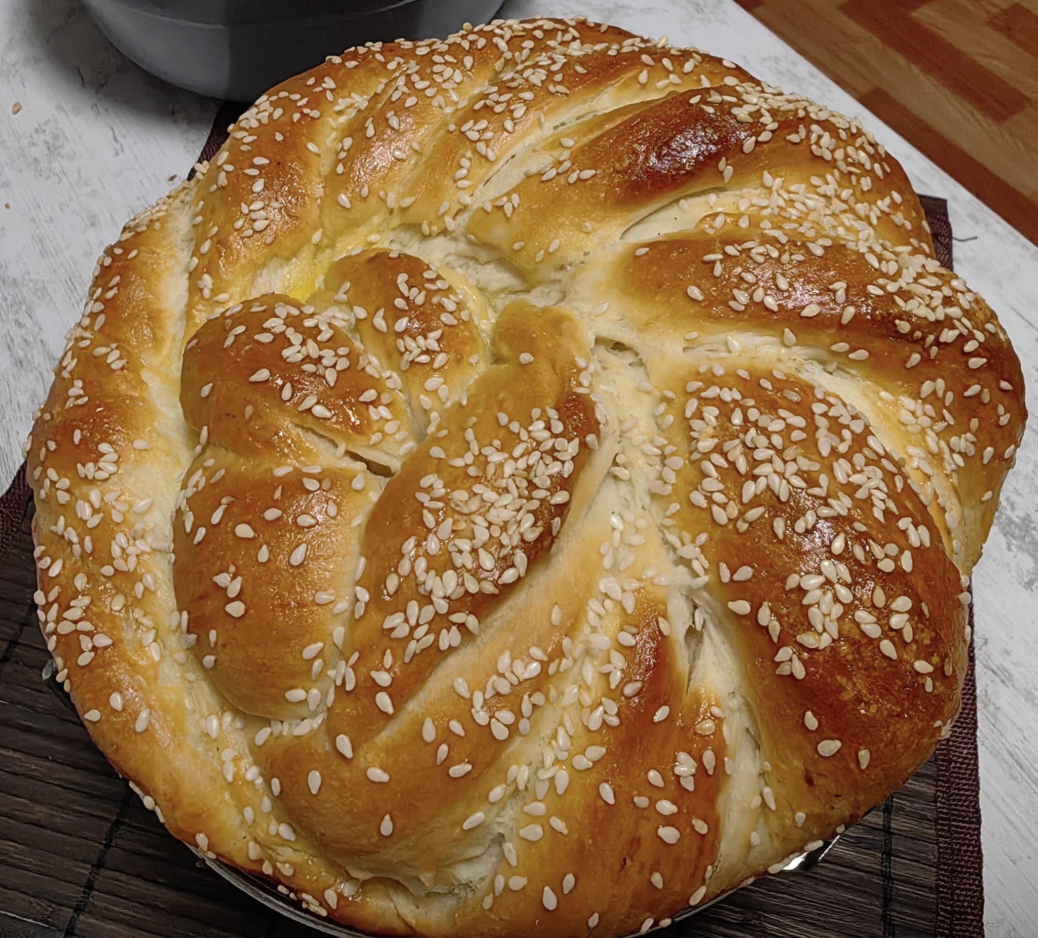 10. Αλείφω την επιφάνεια του ψωμιού με τον χτυπημένο κρόκο και πασπαλίζω με σουσάμι.