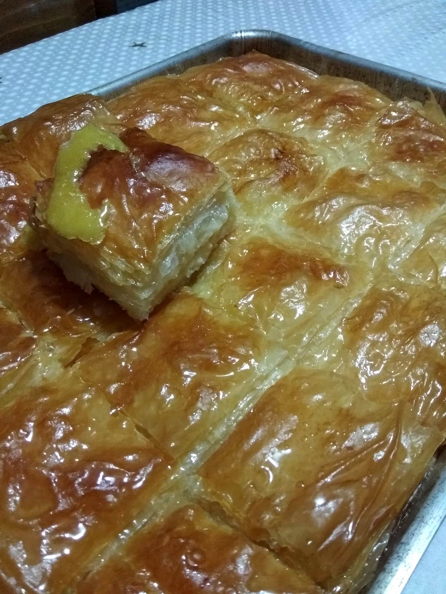 Βάζετε μέσα την κρέμα και τη σκεπάζετε με τα υπόλοιπα φύλλα, τα οποία αλείφετε επίσης με βούτυρο.