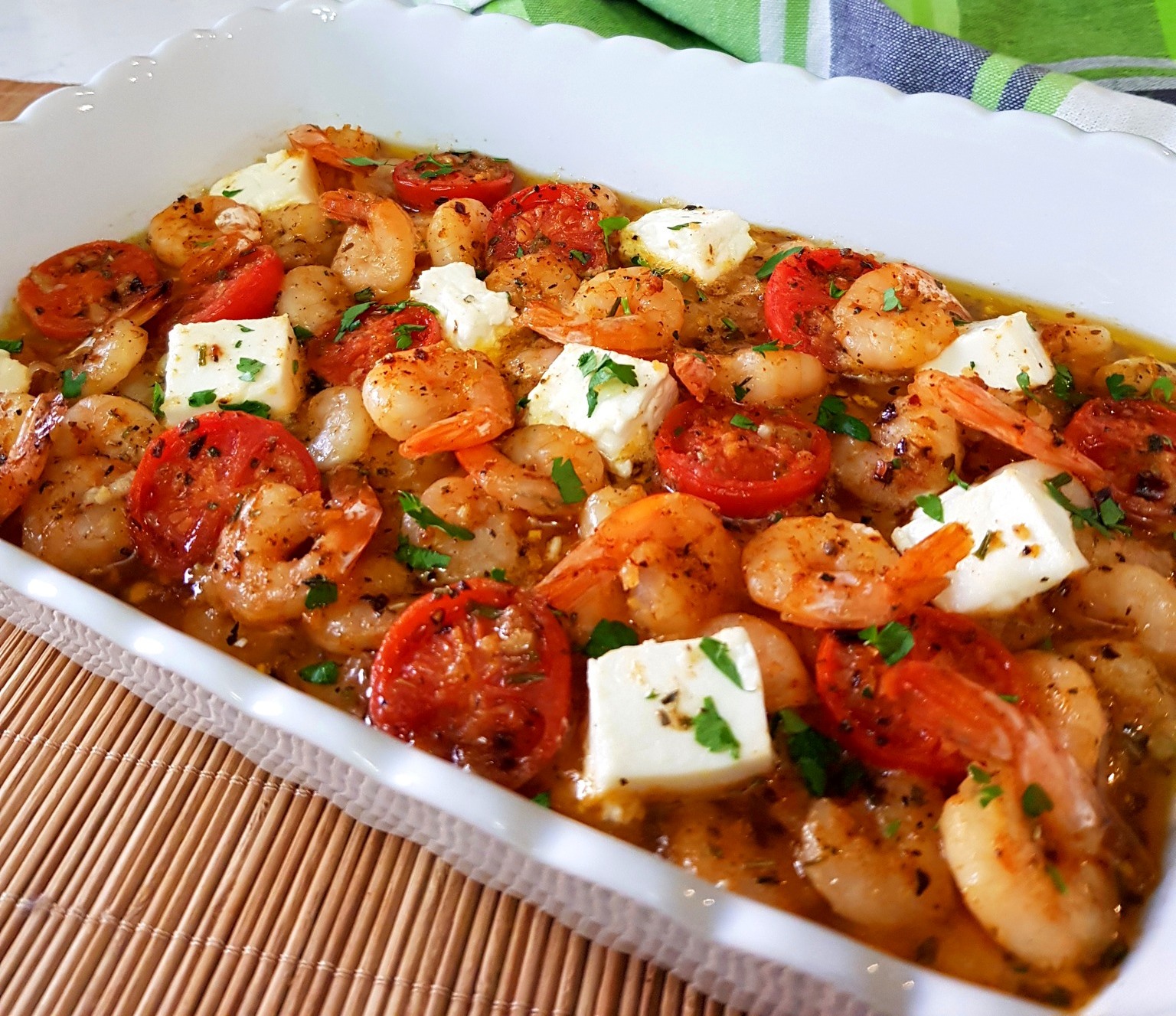 τους κύβους φέτας μεταξύ τους (εάν δεν νηστεύετε). Επιστρέψτε στο φούρνο και ψήστε για άλλα 10 λεπτά, μόλις οι γαρίδες είναι