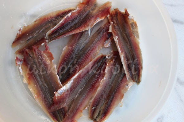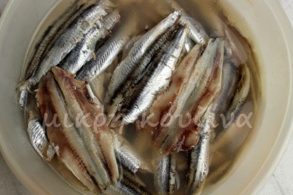 Μετά από 6-7 ώρες, ξεβγάζουμε τα ψάρια, τα καθαρίζουμε από τα κόκκαλα και τυχόν υπολείμματα από τα εντόσθια. Τα ξέβγαλα αρχικά όλα μαζί και στη συνέχεια, προκειμένου να βγάλω το κόκκαλο, τα κρατούσα ένα-ένα κάτω από τρεχούμενο νερό (σε πολύ μικρή ροή), ανασήκωνα με ένα μαχαίρι το κ;oκκαλο στην πάνω μεριά και το τραβούσα προς τα κάτω. Κάνοντας αυτή τη διαδικασία, το ψάρι ανοίγει στα δύο και έχουμε πια ανοιχτά τα φιλέτα.