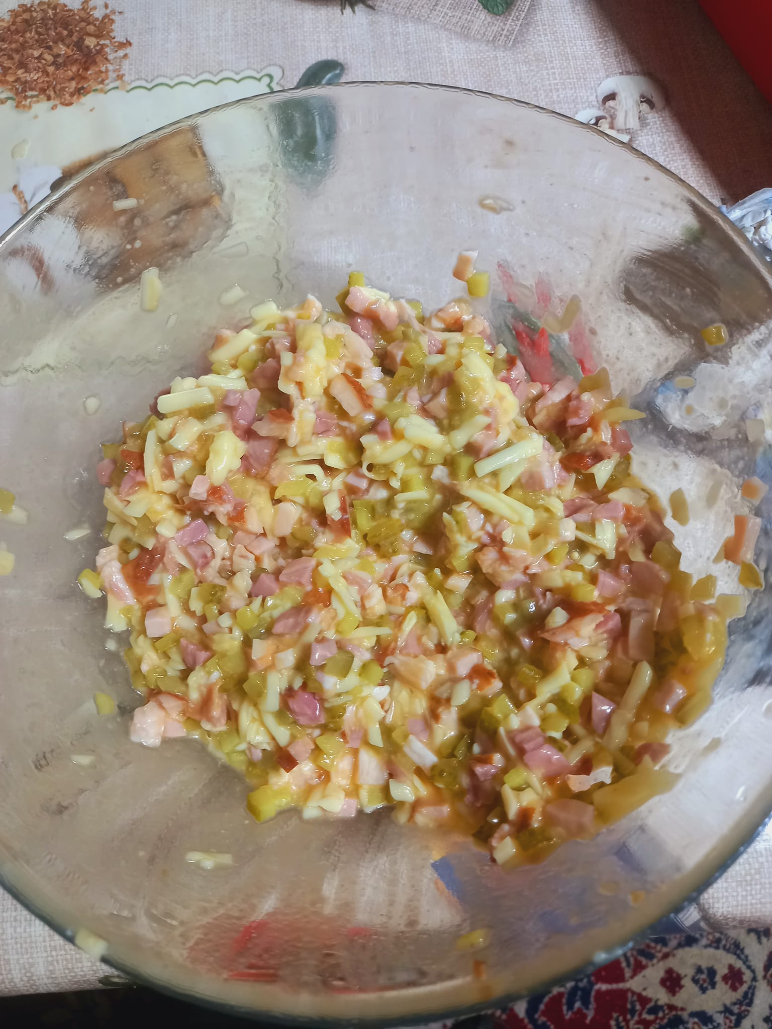 Το μπεικον και τα τουρσιά κόβονται σε μικρά κομμάτια.