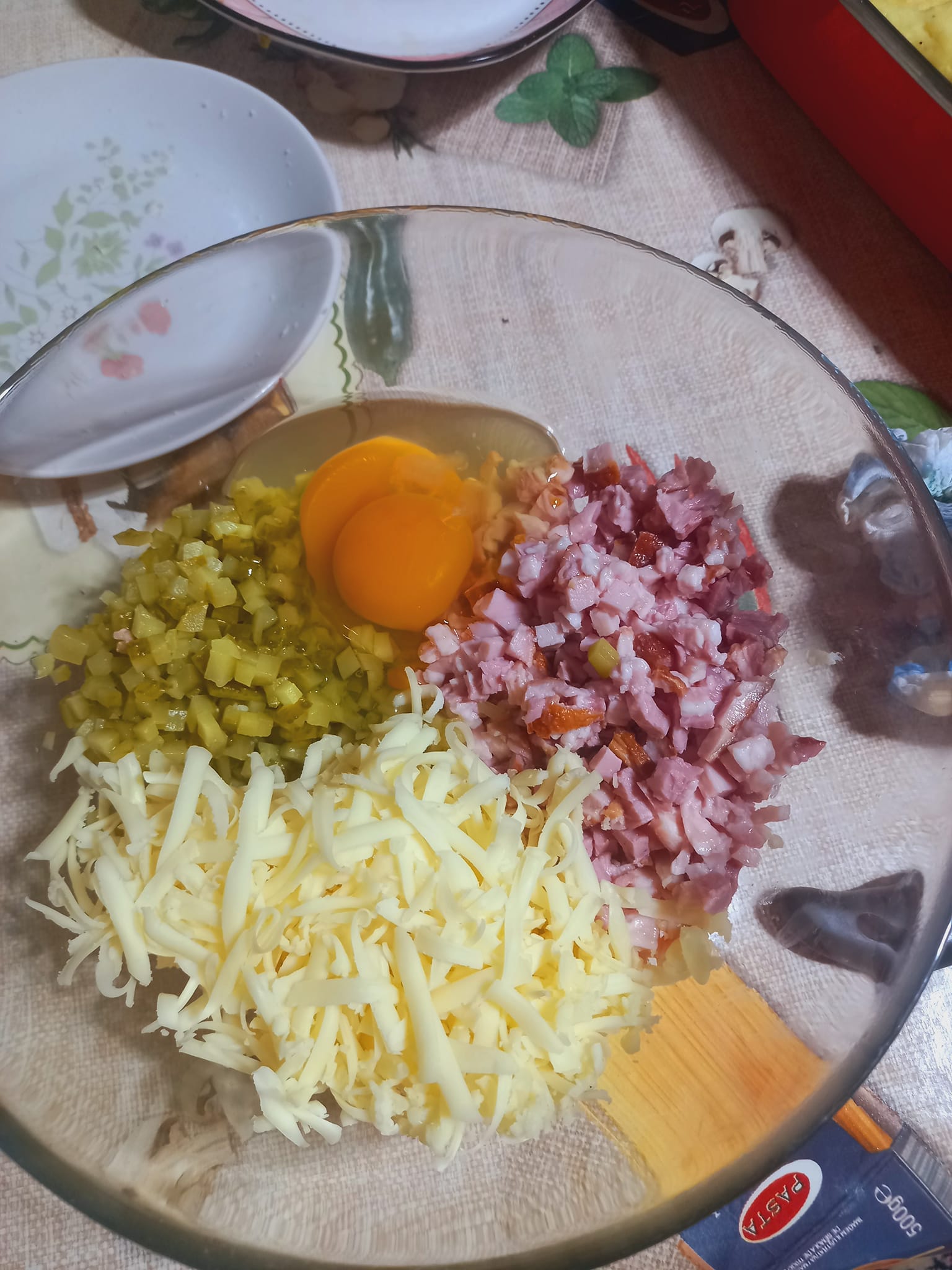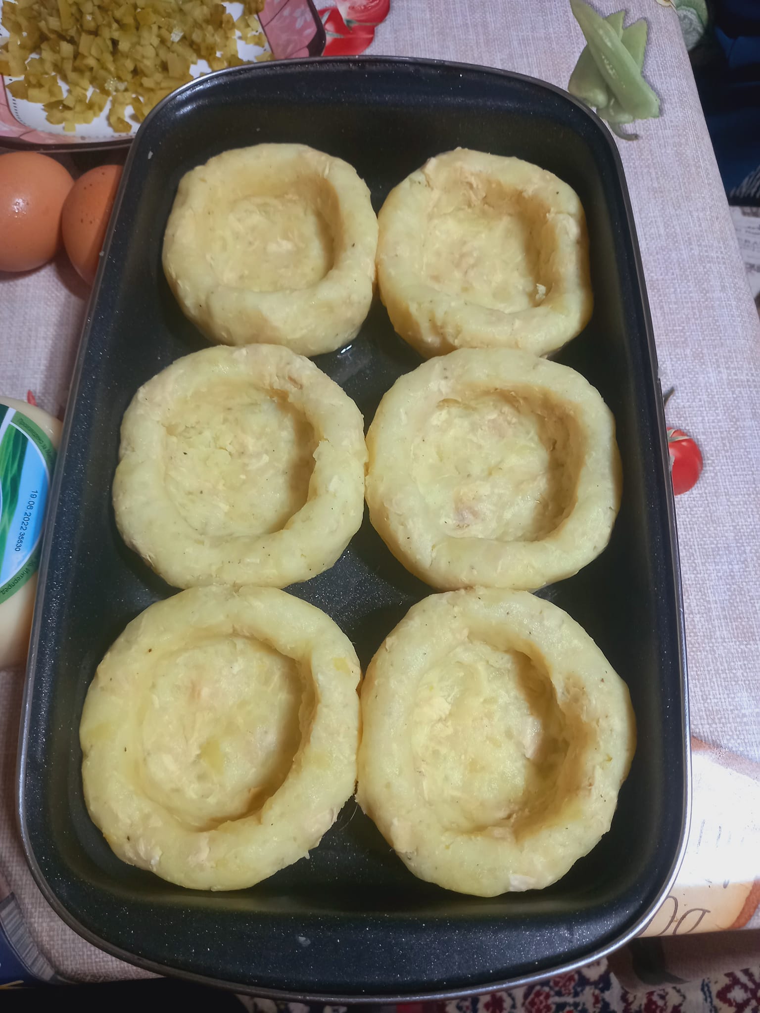 Προσθέστε περίπου 100 γρ τριμμένο κίτρινο τυρί και δύο αυγά. Όλα αυτά τα ανακατεύουμε καλά και γεμίζουμε τις φωλιές της πατάτας.