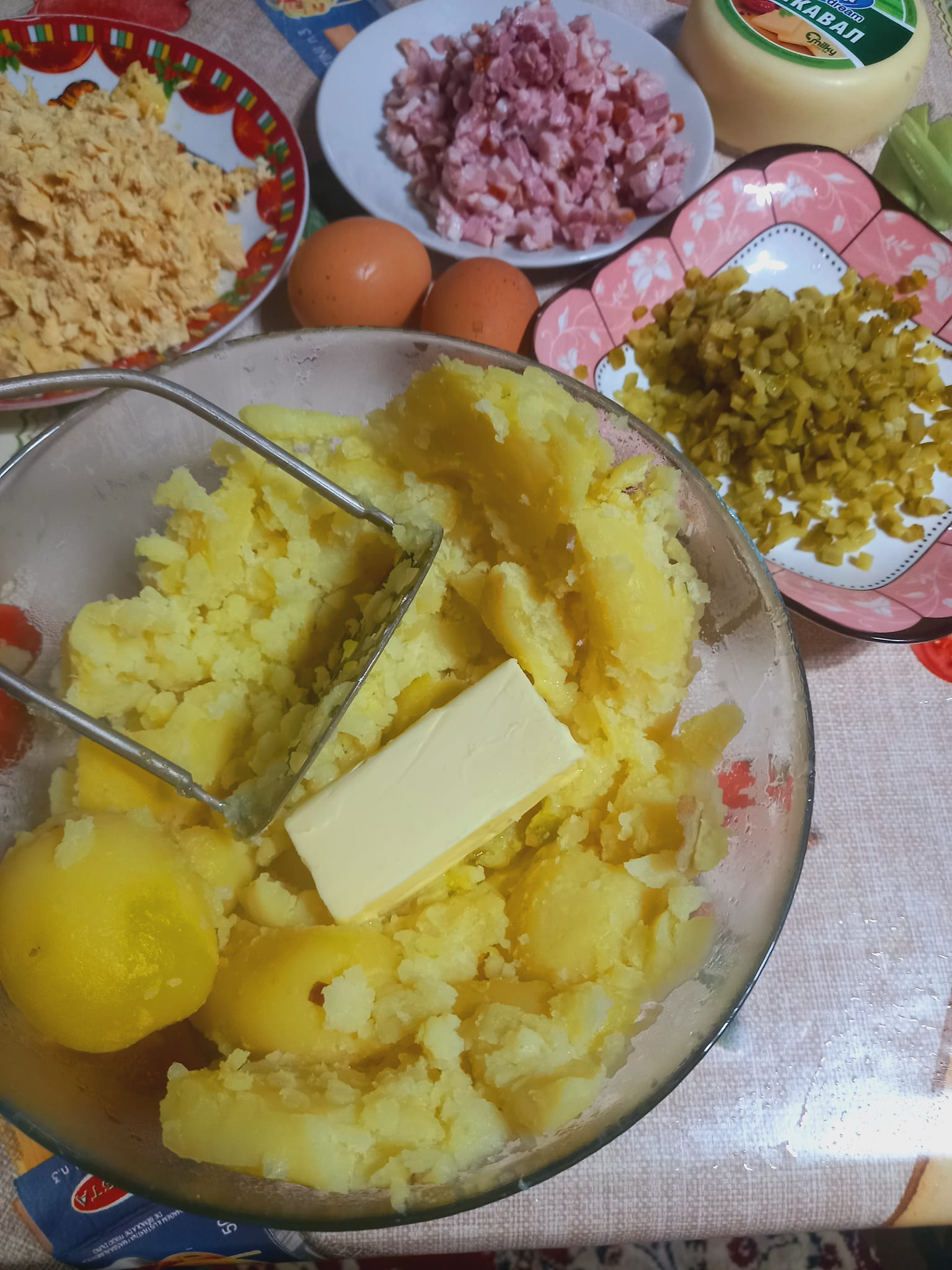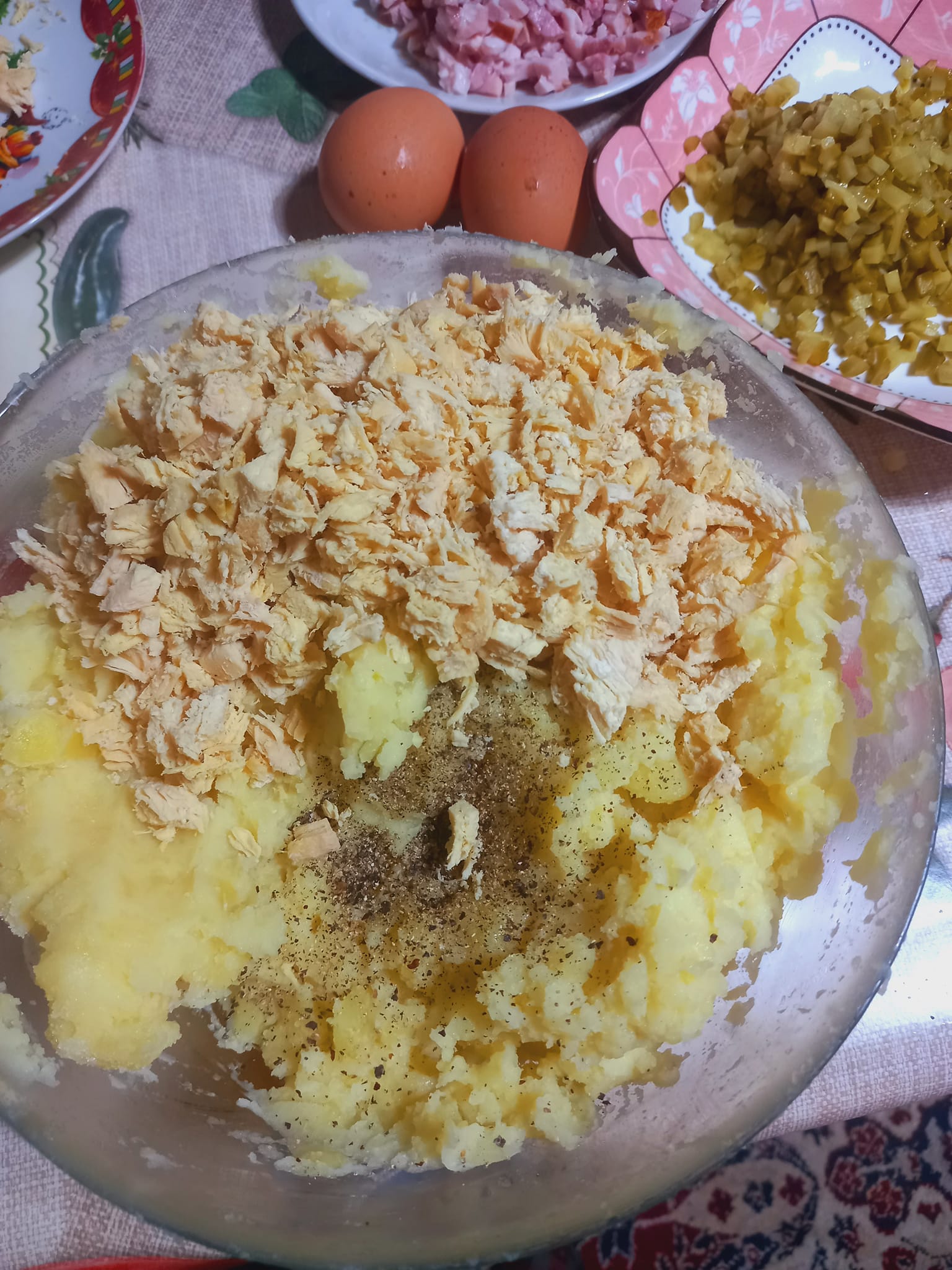 Αφού κρυώσουν και ξεφλουδιστούν οι πατάτες, πολτοποιούνται σε ένα μπολ, προστίθεται βούτυρο και σε αυτές βραστό και κομμένο σε φέτες φιλέτο κοτόπουλου. Αλατοπιπερώνουμε, κάνουμε φωλιές και τις βάζουμε σε ταψί.