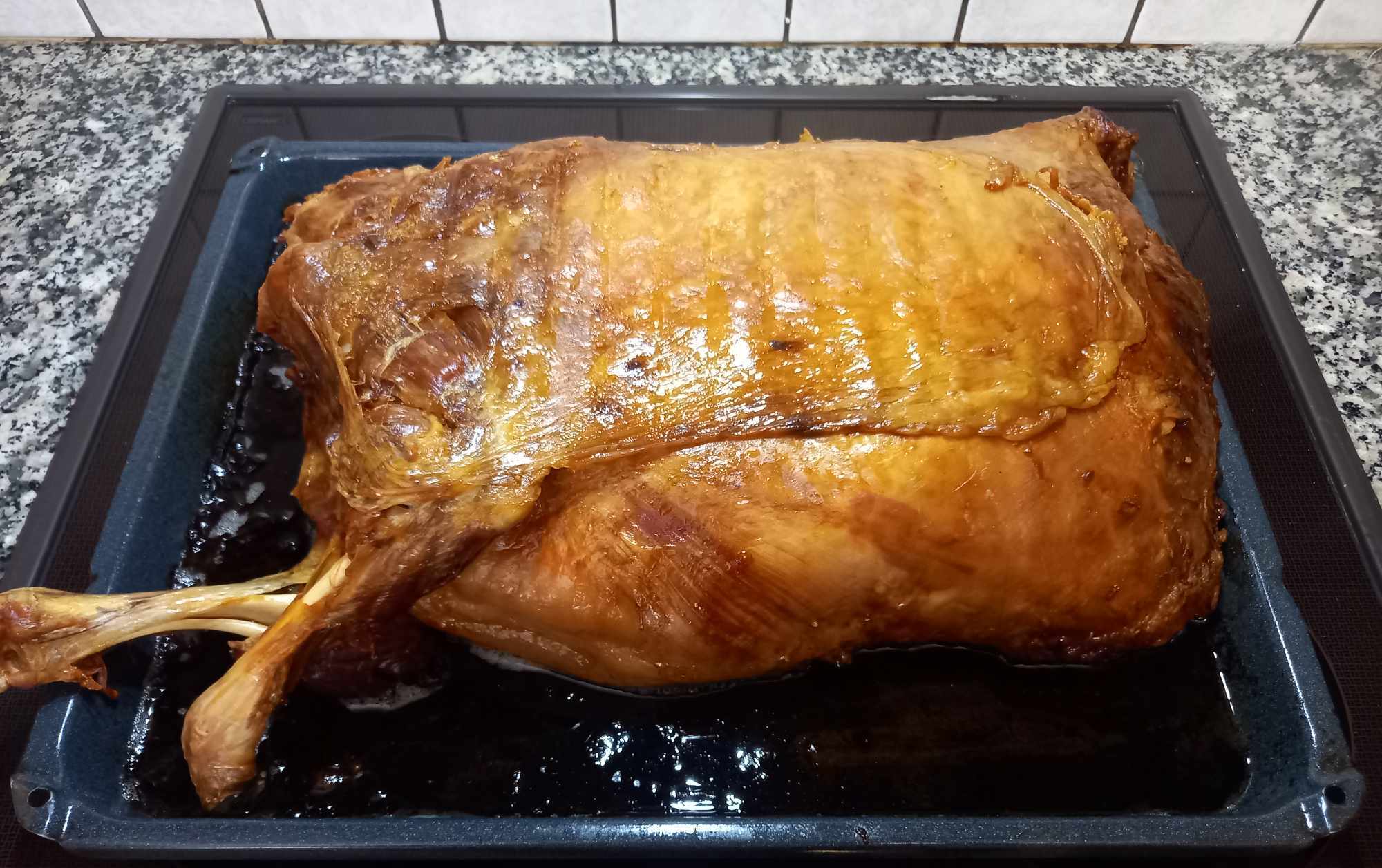 Ψήνουμε το αρνί χωρίς να το σκεπάσουμε για 1 ώρα στους 190 βαθμούς C για να ροδίσει. Κατεβάζουμε τη θερμοκρασία στους 150 βαθμούς C και συνεχίζουμε το αργό ψήσιμο για 4 με 4,5 ώρες ακόμα ή μέχρι το αρνί να γίνει τόσο μαλακό ώστε να λιώνει στο στόμα.