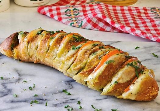 Σήμερα ταξιδεύουμε στην ιταλική κουζίνα με αυτό το νόστιμο γεμιστό σκορδόψωμο ή αλλιώς μπαγκέτας Caprese.