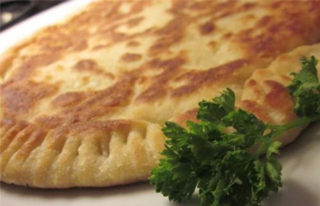 6) Βάζουμε 3-4 κ.σ. φέτα και λίγο φρεσκοτριμμένο πιπέρι στο κέντρο κάθε ζυμαριού, το διπλώνουμε και ξαναπερνάμε με τον πλάστη ώστε να μείνει η γέμιση στο κέντρο και να ξανασχηματίσουμε δίσκο.