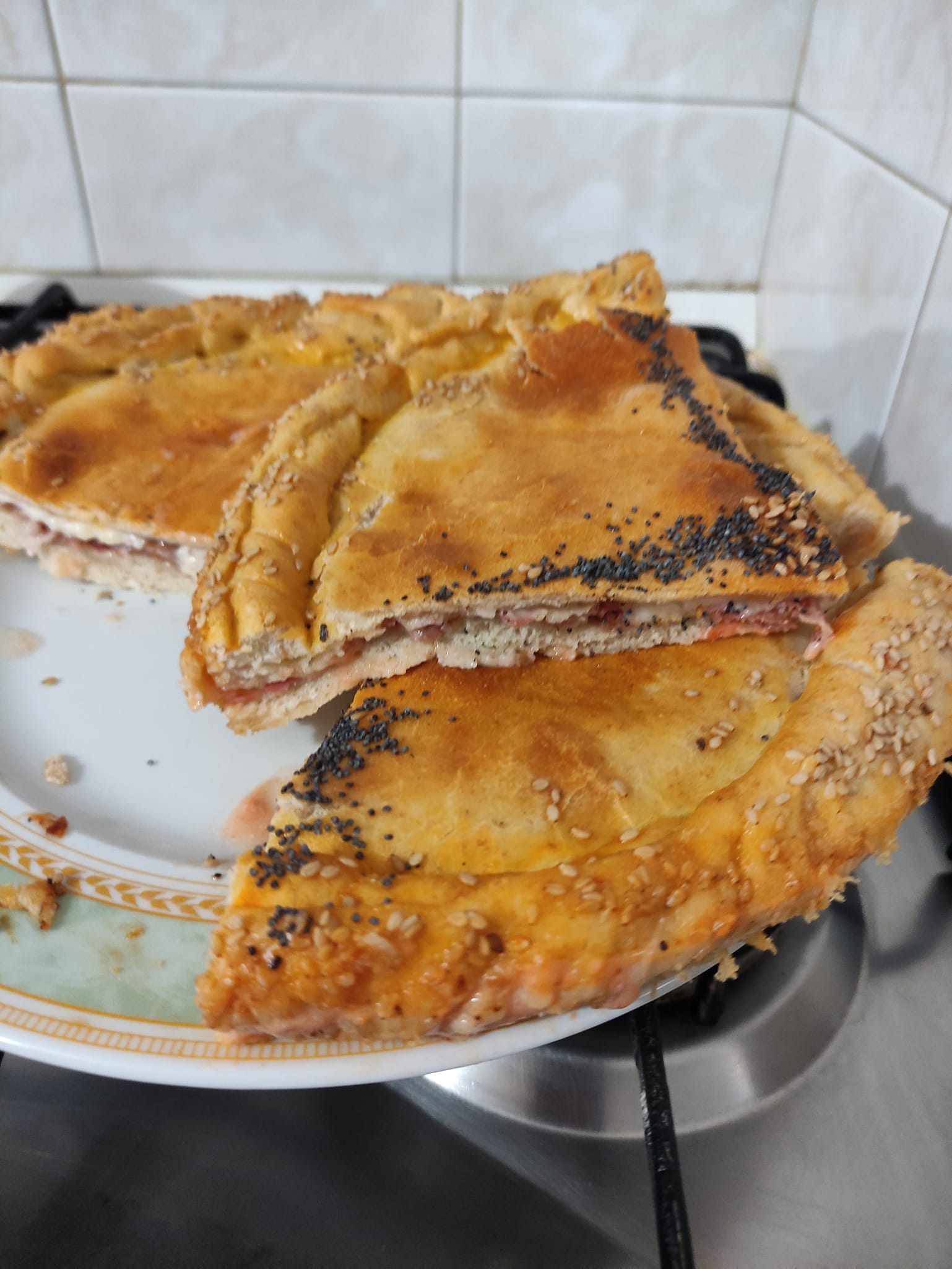 Έφτιαξα ένα αρκετά λεπτό φύλλο, έβαλα τη γέμιση πρώτα ντομάτα μετά μοτσαρέλα τέλος περίπου 200 γρ ζαμπον φέτες, σκέπασα με το δεύτερο φύλλο αλείψα με κρόκο αυγού πασπαλισα με παπαρονοσπορο
