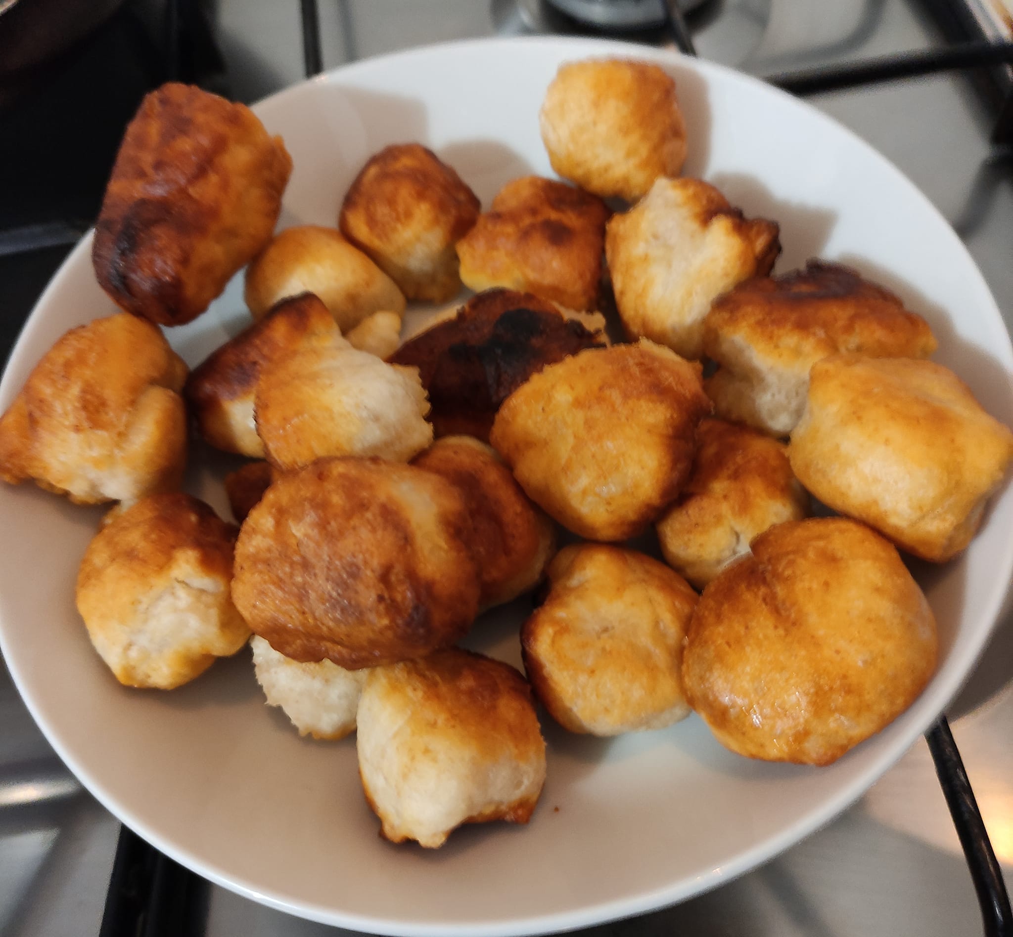 Πήρα τη ζύμη που περίσσεψε δημιουργώντας μπαλάκια με τα χέρια μου τα έβαλα σε καυτό λάδι και voilà 😋 .