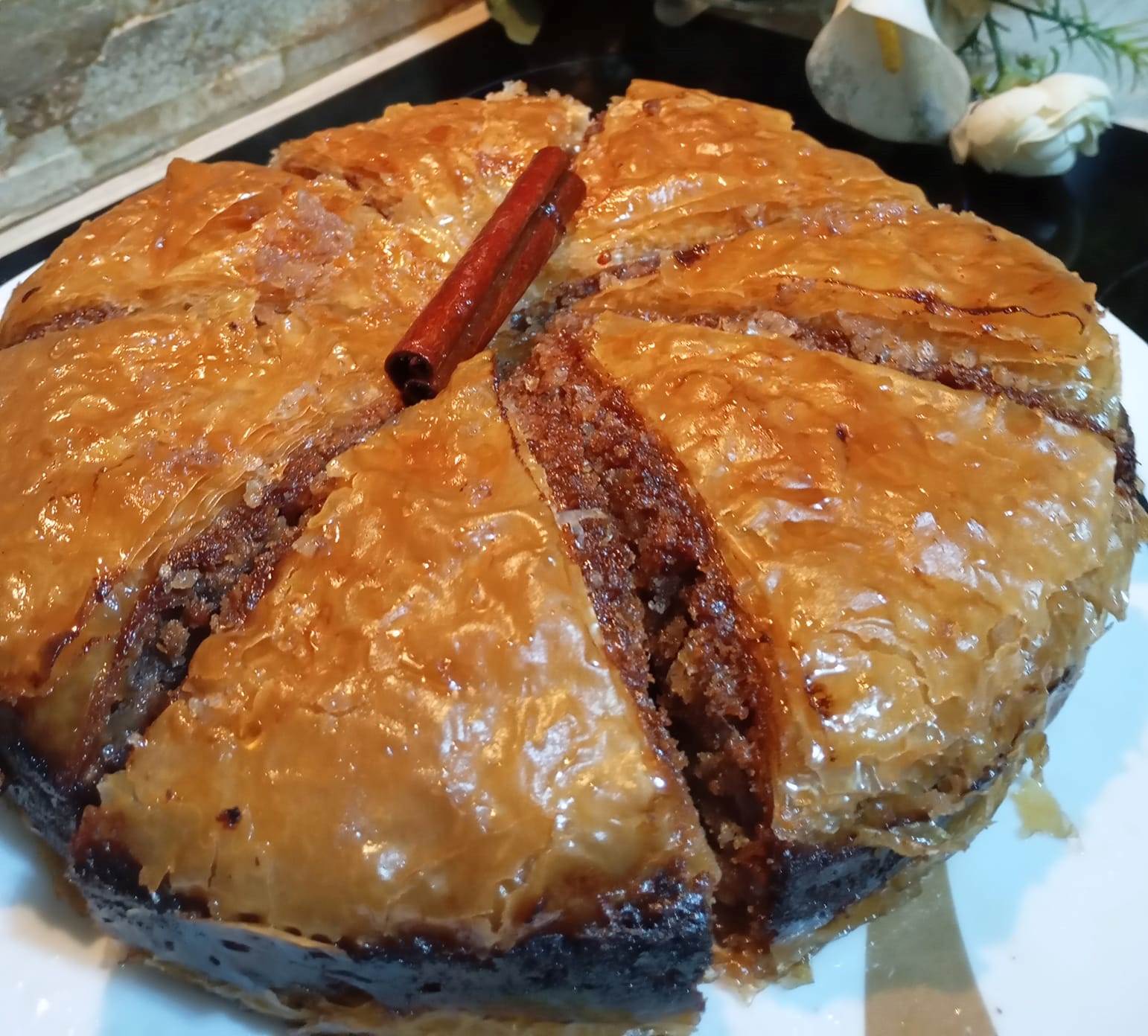 Αυτό το γλυκό θα μπορούσα να το κάνω στο ταψί του φούρνου αλλά επειδή το ήθελα σαν τούρτα το έκανα σε αποσπώμενη φόρμα τα επάνω φύλλα τα έκοψα πριν τα τοποθετήσω στο σκεύος