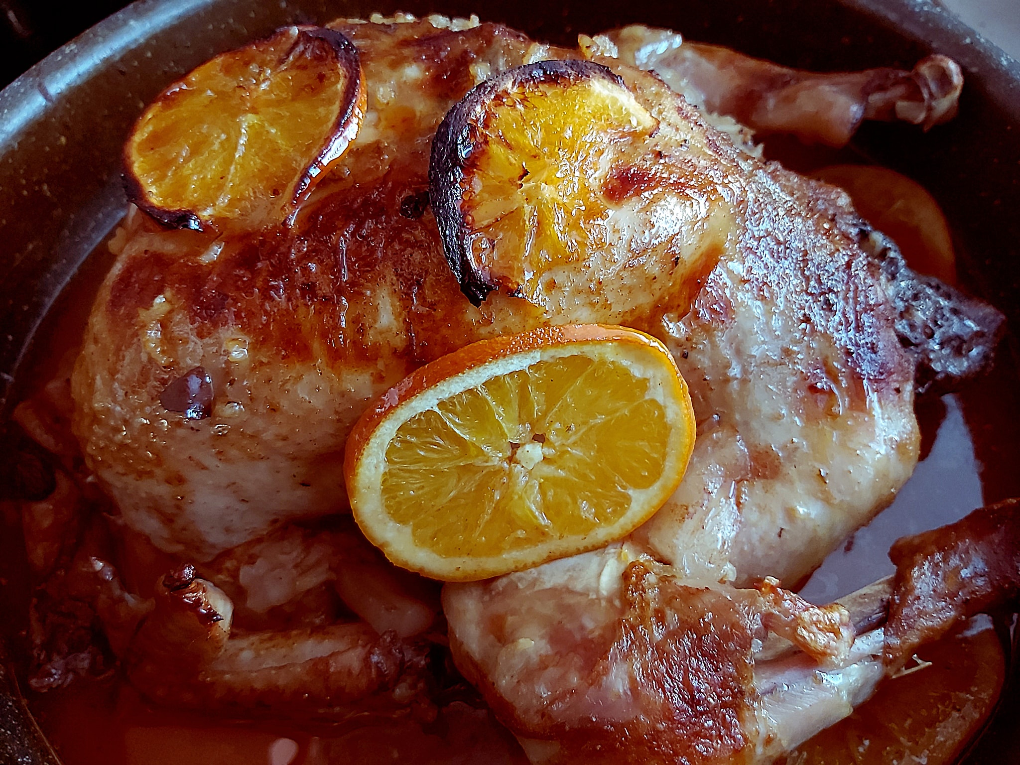 Τοποθετούμε πάνω κομμάτια από βούτυρο και φετες πορτοκαλιού, /ίσως λίγο μπέικον/ και ψήνουμε στους 200 βαθμούς, κάτω από αλουμινόχαρτο, για 2μιση ώρες.