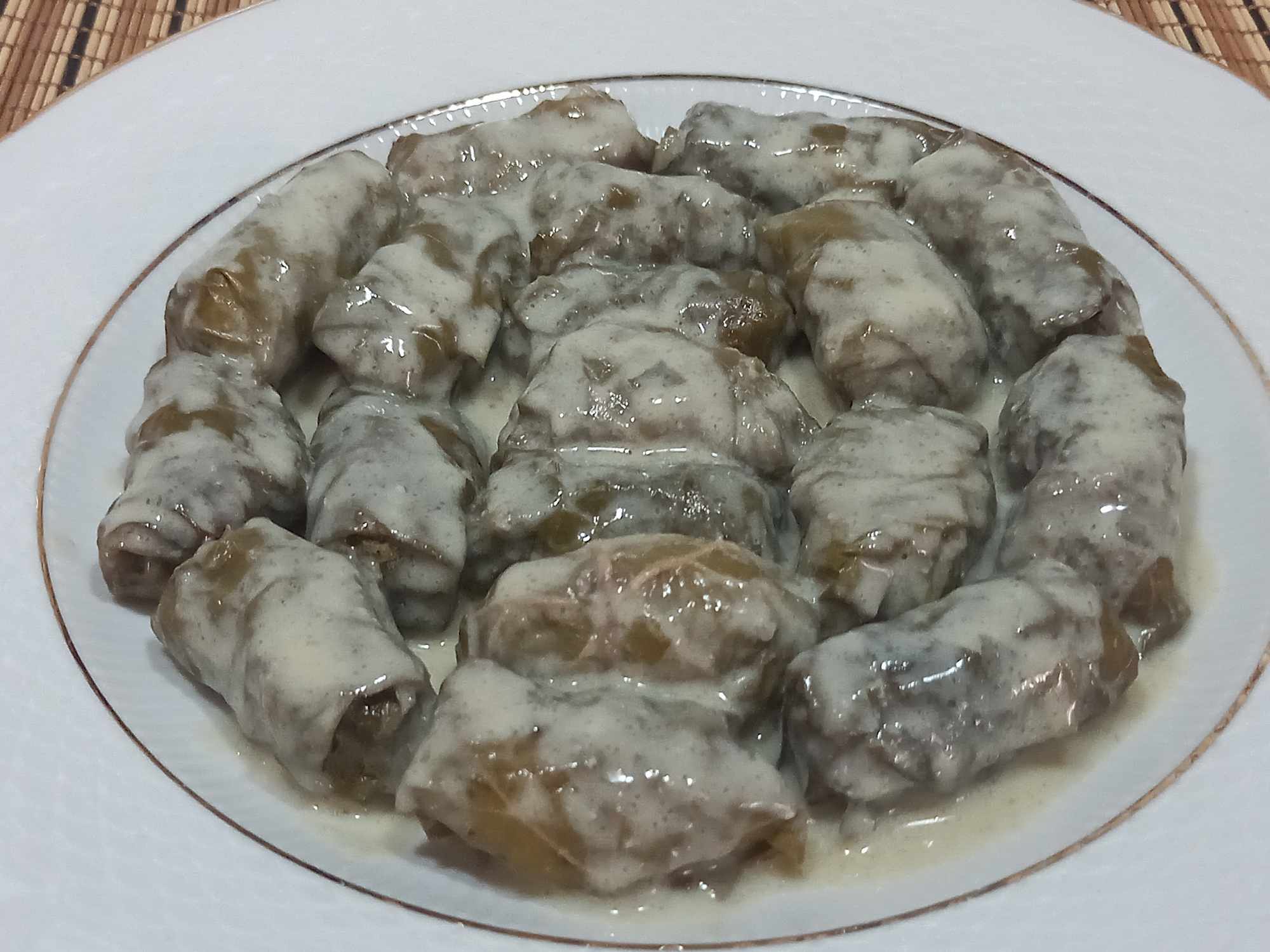 Επαναλαμβάνουμε με όλα τα φύλλα και όταν τελειώσουμε βάζουμε τα ντολμαδάκια δίπλα-δίπλα στην γάστρα όσο πιο στριμωχτά μπορούμε.