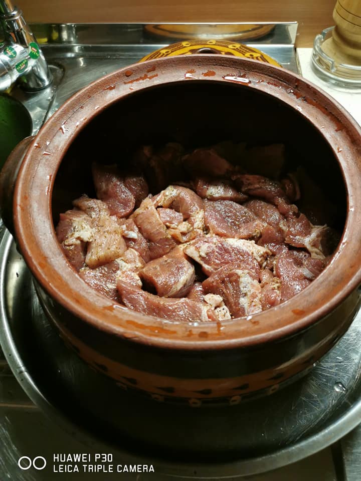 Πρώτα έβαλα ένα χοιρινό λαιμό κομμένο σε φέτες, αλάτι, πιπέρι, μπαχαρικό μπάρμπεκιου και ανακάτεψα.