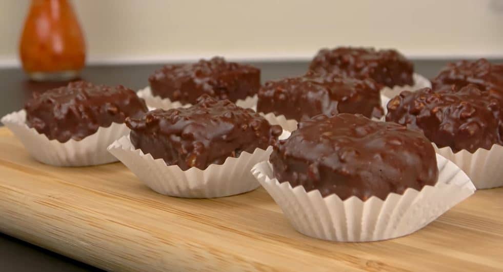 Οταν είναι έτοιμοι βάζουμε όλους τους κύβους στην καταψυξη για 15 λεπτά. Στο χρόνο αυτό λιώνουμε τη σοκολάτα σε ένα μπεν μαρί και ριχνουμε και το λάδι στο τελος .