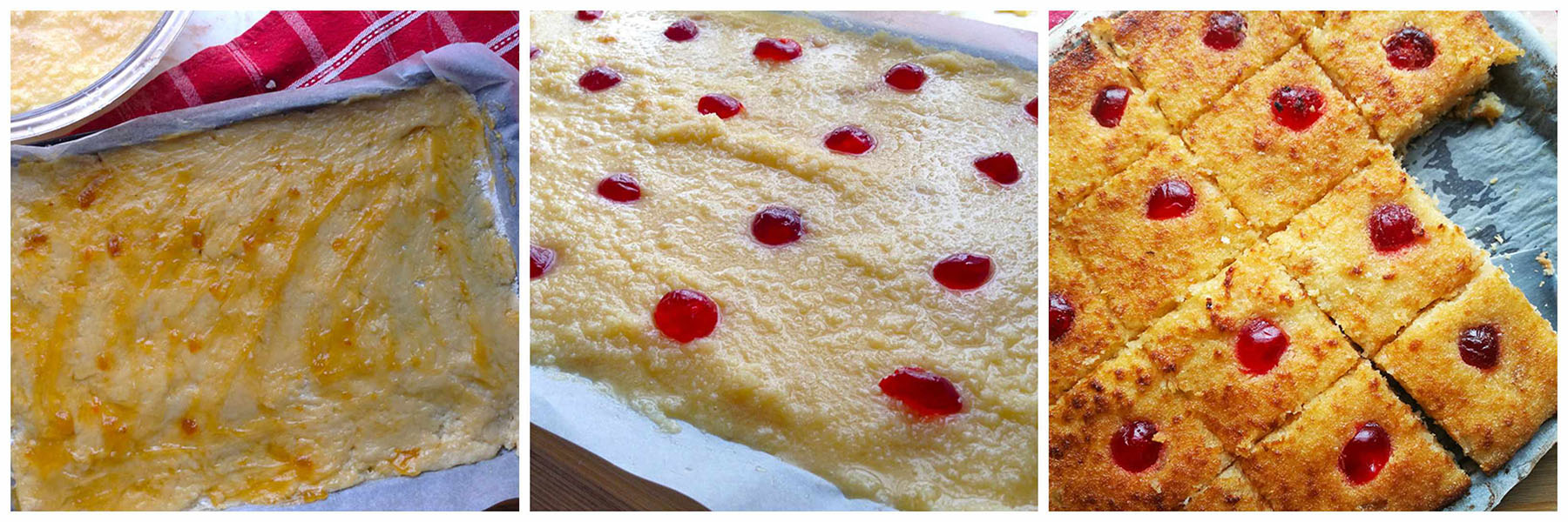 Απλώστε το μείγμα καρύδας με σιρόπι πάνω τη βάση μαρμελάδας. Τοποθετήστε τα μισά κεράσια πάνω από την γέμιση καρύδας. Ψήστε για 25 έως 30 λεπτά.
