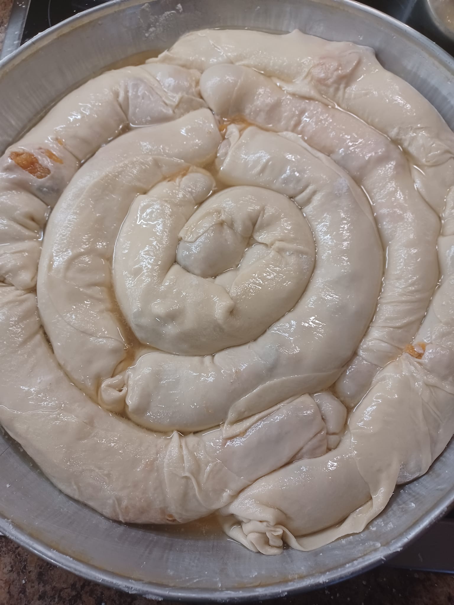 Ζυμωνουμε καλά τα υλικά μέχρι να βγάλει η ζύμη φουσκάλες χωρίζουμε σε 10 μπαλάκια ανοίγουμε με νισεστε λαδωνουμε το φύλλο βάζουμε γέμιση ρολαρουμε βάζουμε στο ταψί και συνεχίζουμε με το ίδιο τρόπο μέχρι να γεμίσει το ταψί