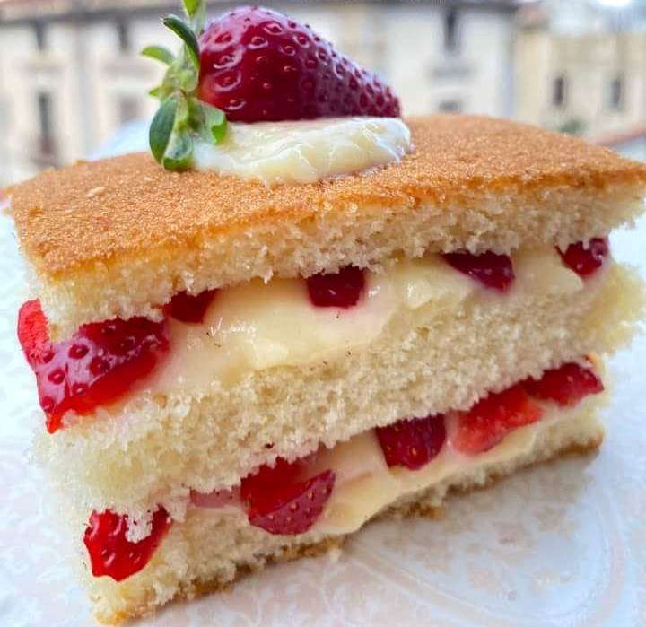Τώρα απλώστε μια στρώση κρέμας κρέμας ανάμεσα στις δύο πλευρές με τις φράουλες κομμένες σε μικρά κομμάτια