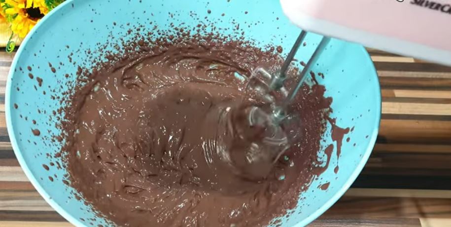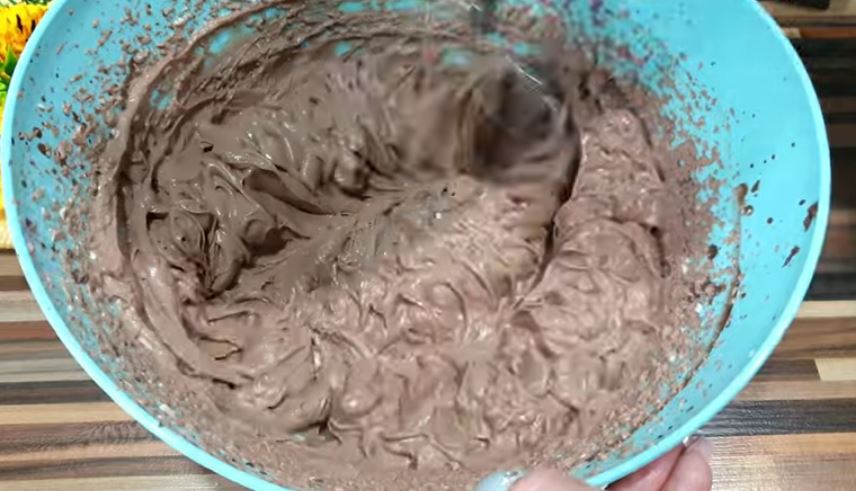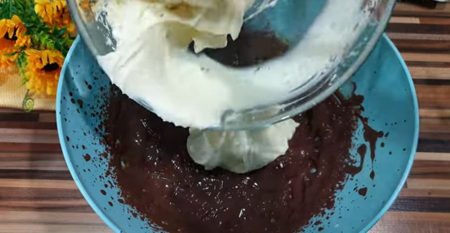 Ρίχνουμε αυτό το μείγμα στο μείγμα της σοκολάτας και χτυπάμε με το μίξερ περίπου 5 λεπτά.