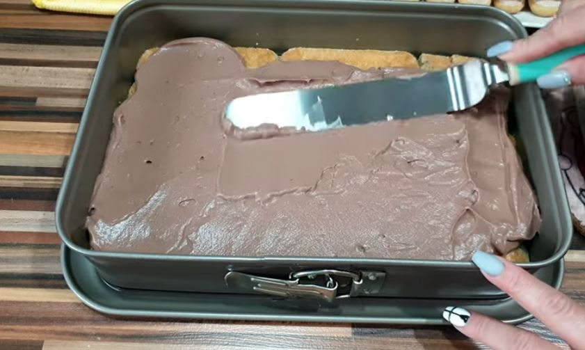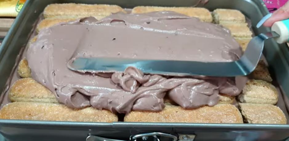Την απλώνουμε να πάει παντού. Από πάνω βάζουμε άλλη μια στρώση σαβουαγιάρ και την υπόλοιπη κρέμα.Την απλώνουμε να πάει παντού.