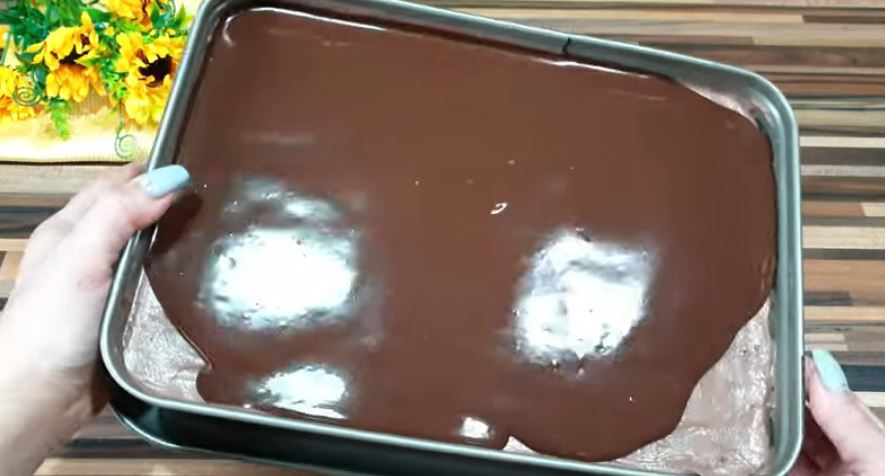 Ρίχνουμε την υγρή σοκολάτα πάνω απ το γλυκό μας.Απλώνουμε να πάει παντού και βάζουμε στο ψυγείο για 2-3 ώρες.