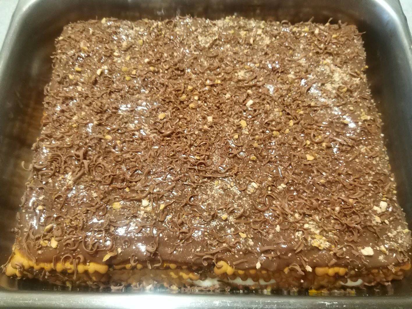 Ρίχνουμε την υγρή σοκολάτα πάνω απ το γλυκό μας.Απλώνουμε να πάει παντού και βάζουμε στο ψυγείο για 2-3 ώρες.