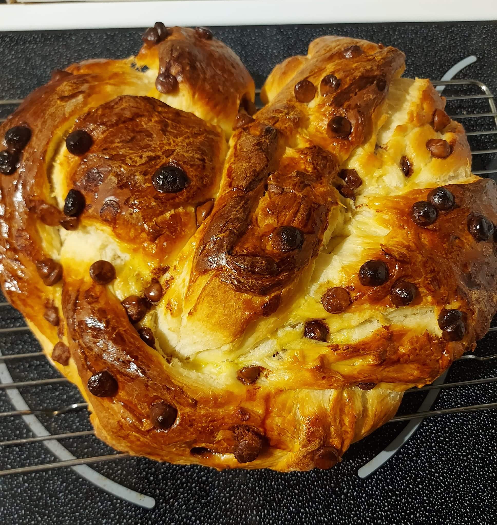 Το τυλίγετε και το κόβεται σε τρία κορδόνια και κάνετε πλεξούδα τη βάζετε σε στρογγυλό ταψί με χαρτί ψησίματος, το αλείφεται με αυγό και σκορπατε σοκολάτα επάνω