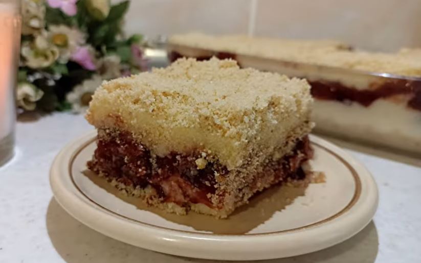 Σ ένα παραλληλόγραμο πυρέξ απλώνουμε στον πάτο την μισή φρυγανιά.Την στρώνουμε ομοιόμορφα με μια σπάτουλα.Αδειάζουμε από πάνω την μισή κρέμα με το σιμιγδάλι και την απλώνουμε με μια σπάτουλα να πάει παντού.