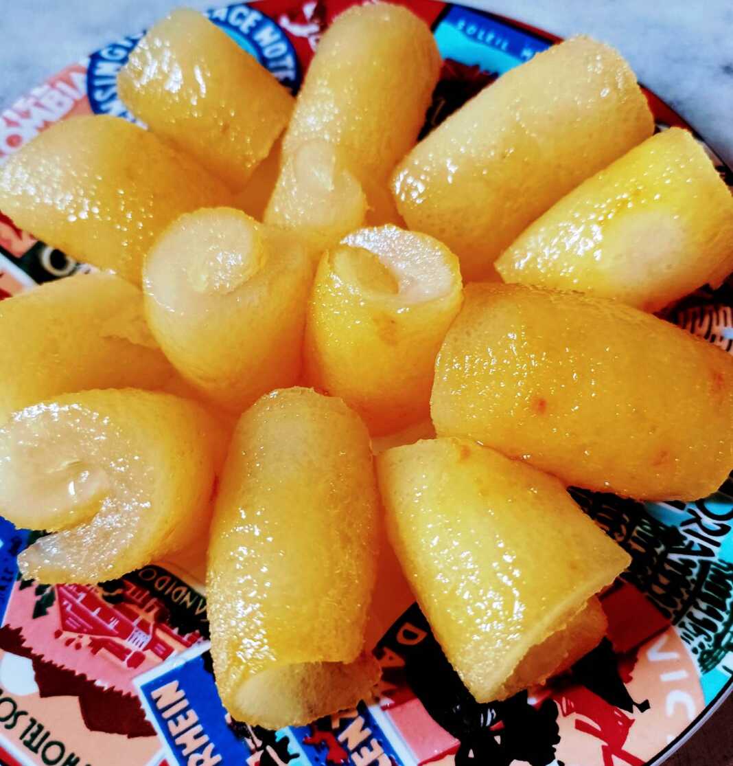 - Βράσιμο των φλούδων: Βάζουμε τις φλούδες σε μια κατσαρόλα και τις σκεπάζουμε με νερό. Βράζουμε για 5 λεπτά. Στραγγίζουμε και επαναλαμβάνουμε το βράσιμο για 5 λεπτά ακόμα. Αδειάζουμε το νερό κάθε φορά.