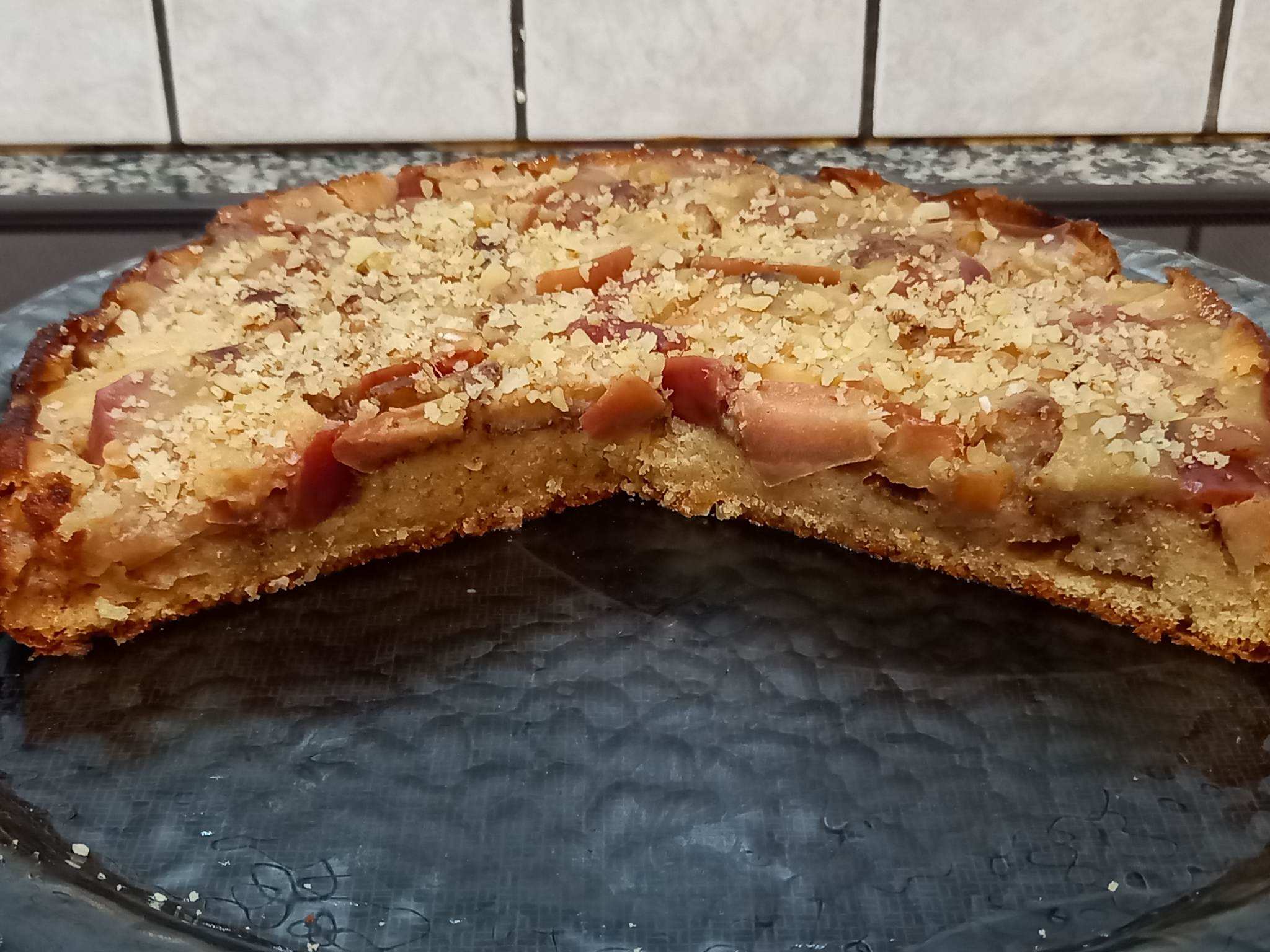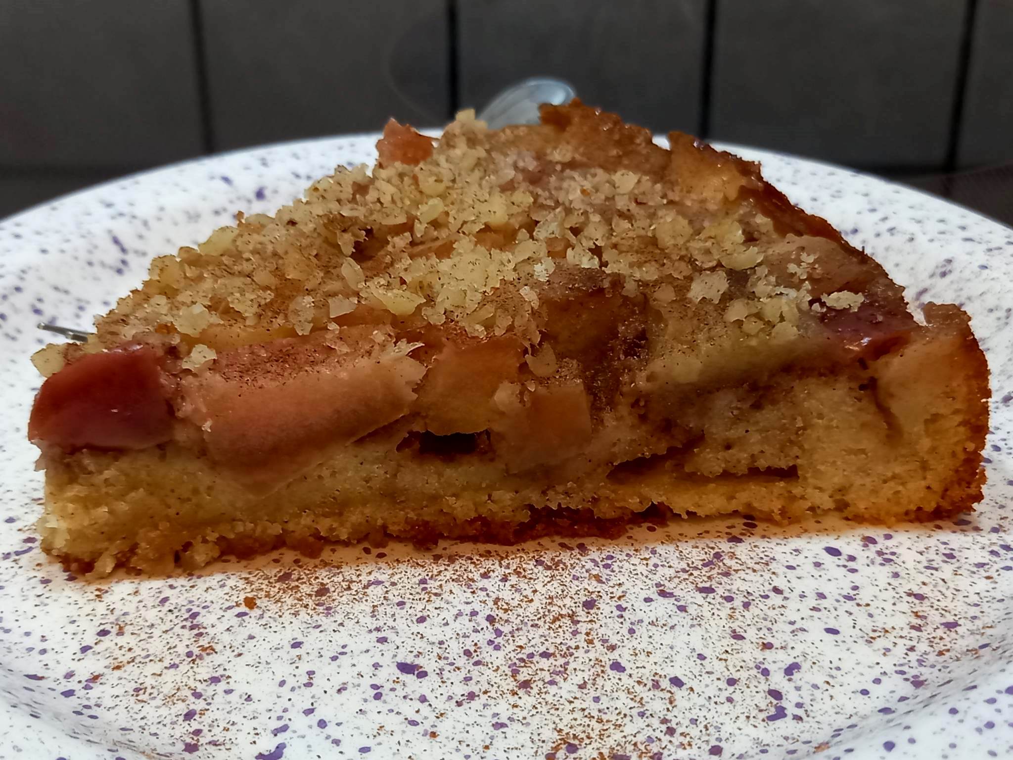 Αδειάζουμε το μείγμα μέσα στην στρωμένη με μήλα φόρμα ισιώνουμε την επιφάνεια και ψήνουμε σε προθερμασμένο φούρνο στον αέρα στους 180 βαθμούς για περίπου 35-45 λεπτά αναλόγως τον φούρνο.