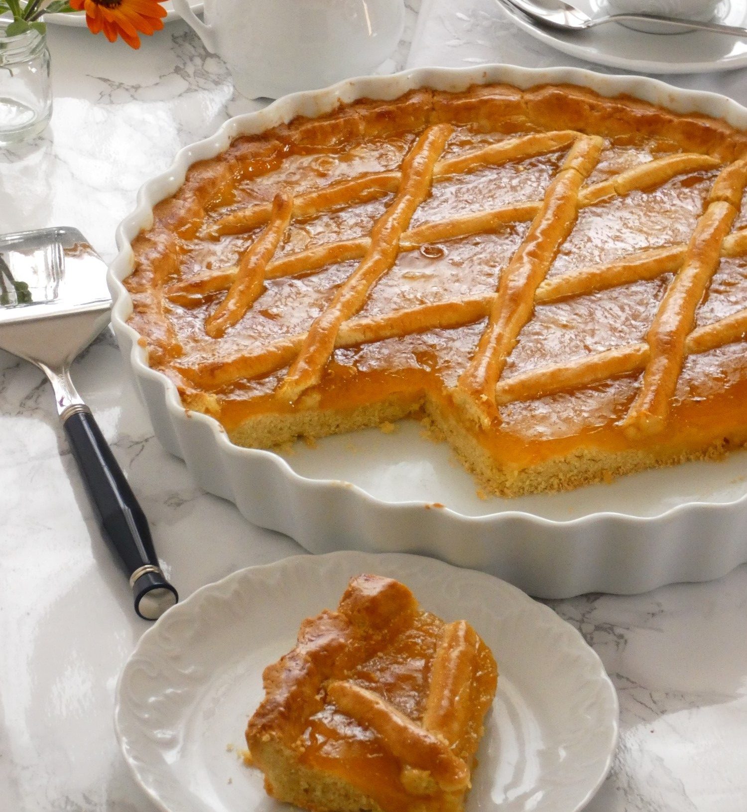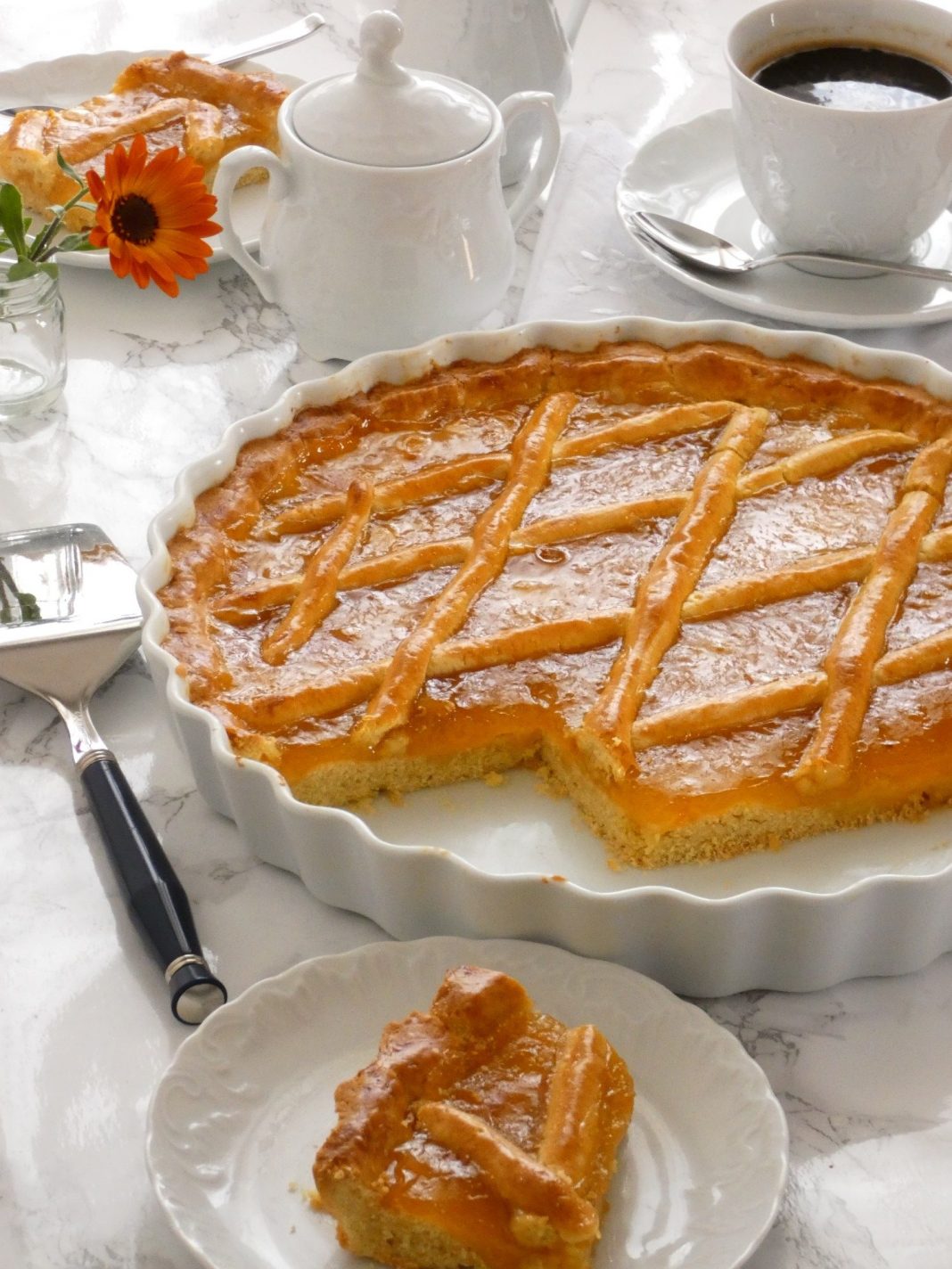 13 Τοποθετήστε τα κορδόνια ζύμης πάνω από το στρώμα μαρμελάδας για να σχηματίσουν ένα πλέγμα.