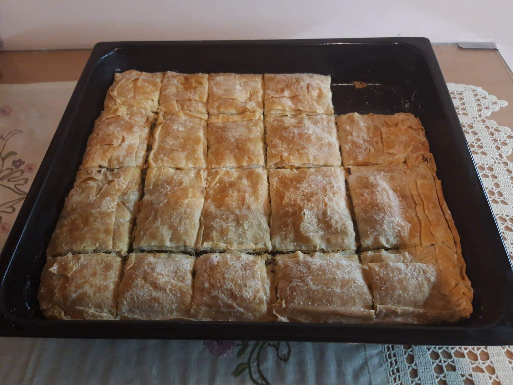 Ψήνετε σε καλά προθερμασμένο φούρνο στους 180ºC στις αντιστάσεις για περίπου 1 ώρα και 10 λεπτά μέχρι τα φύλλα να ροδίσουν και να ξεκολλάει η πίτα από τα τοιχώματα του ταψιού. Προτού την βγάλετε κοιτάξτε αν ψήθηκε και από κάτω.