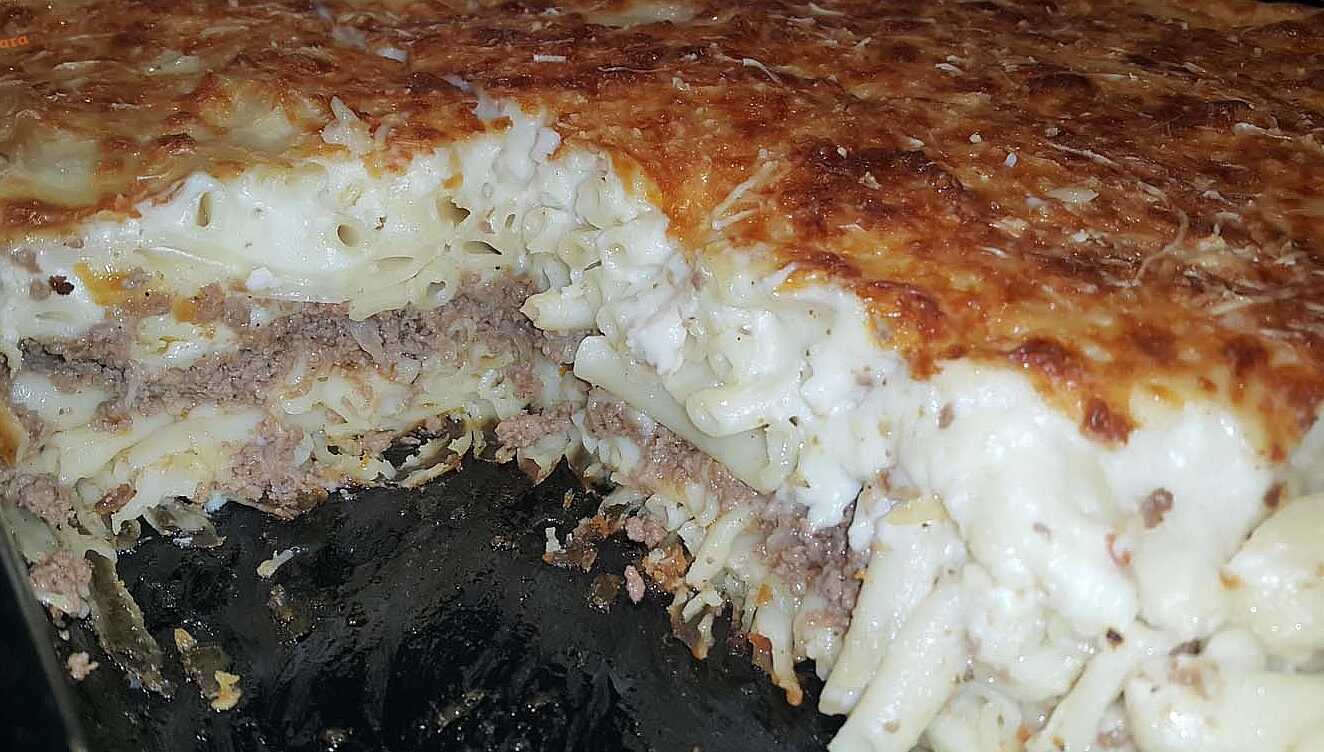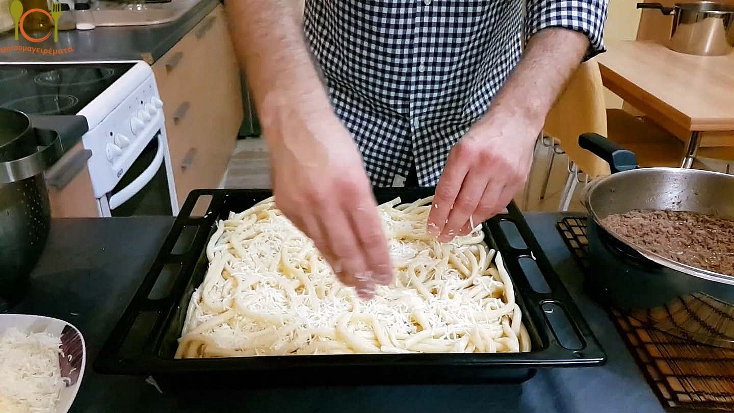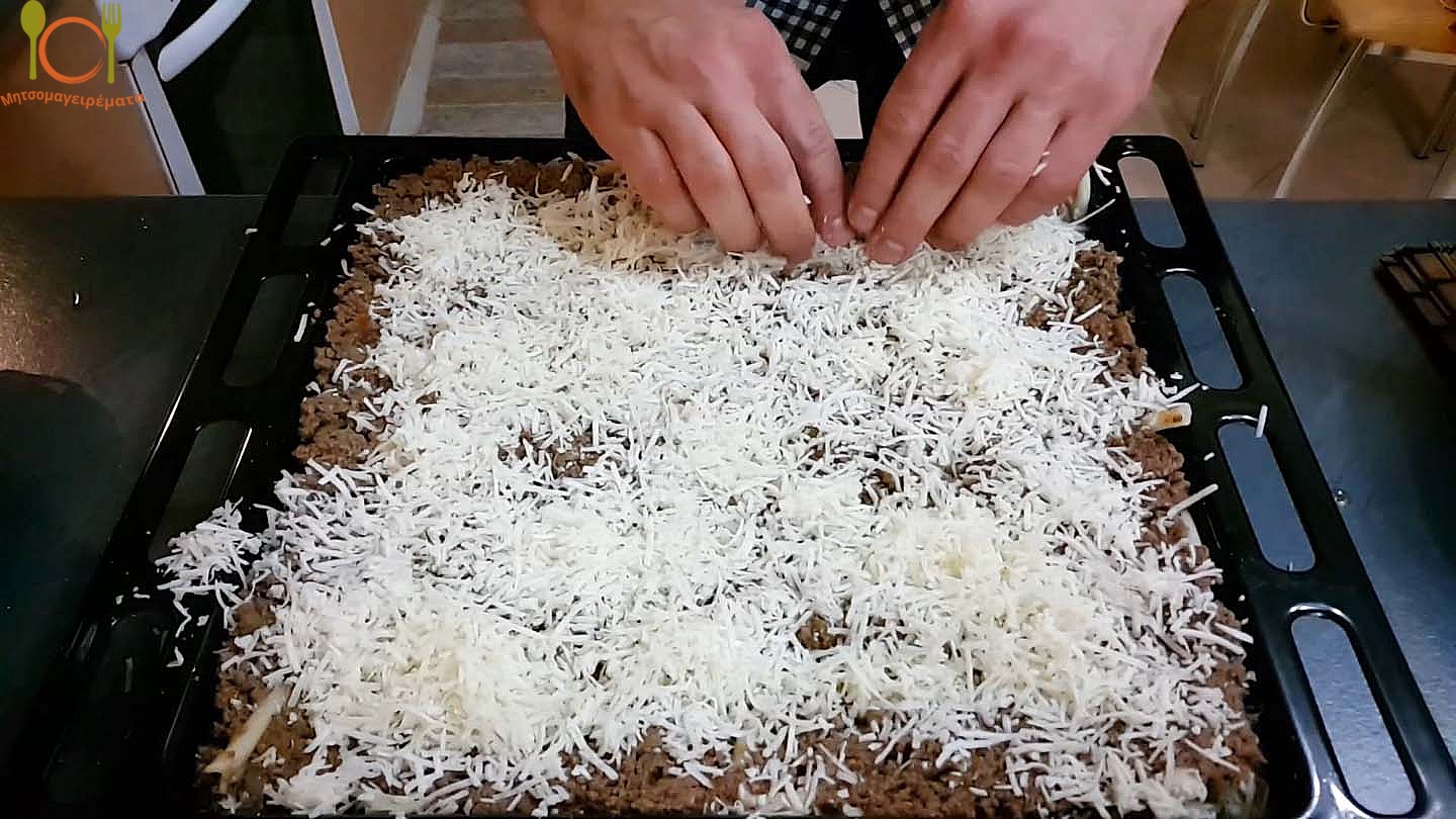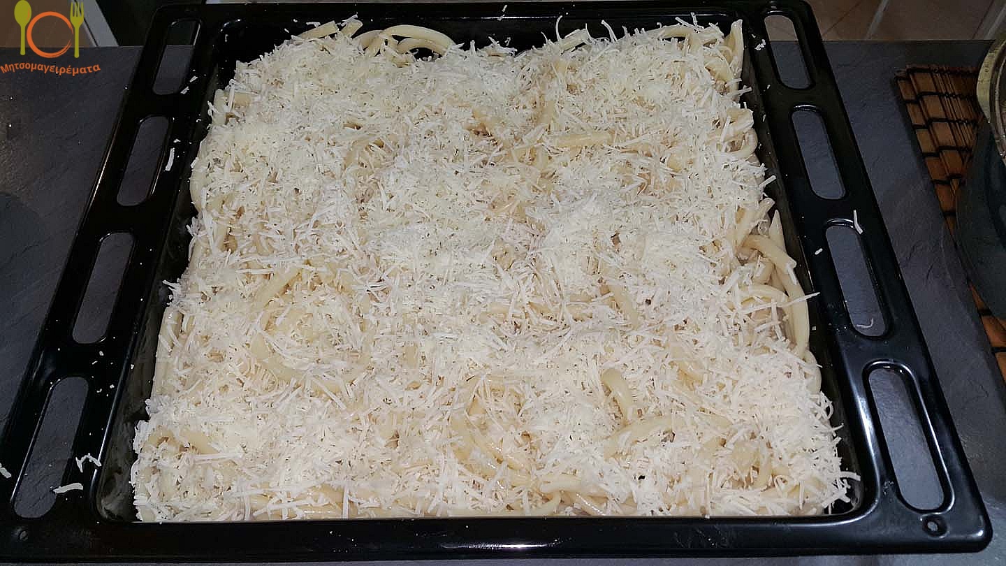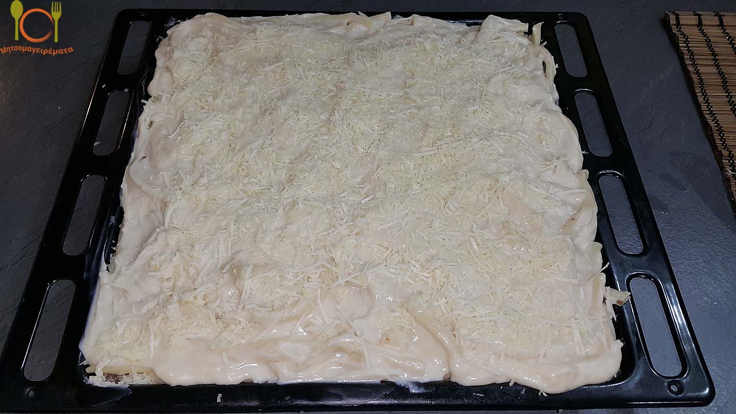 Τέλος απλώνουμε τη μπεσαμέλ, βάζουμε το υπόλοιπο κεφαλοτύρι και τοποθετούμε το ταψί σε προθερμασμένο φούρνο στους 220 βαθμούς για περίπου 45 λεπτά.