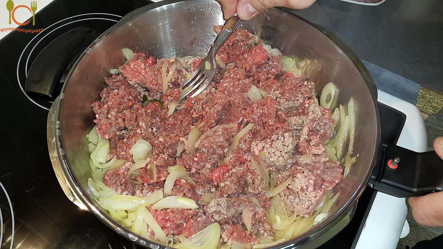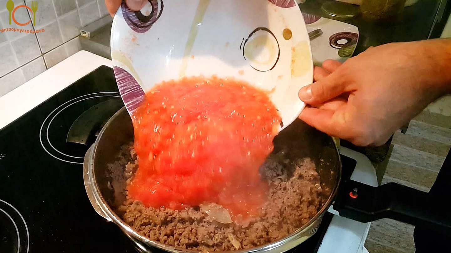 Βάζουμε τον κιμά και τον ανακατεύουμε με τα κρεμμύδια, ώστε να τσιγαριστεί και να «ασπρίσει». Προσθέτουμε τα μπαχαρικά και, μόλις αλλάξει χρώμα ο κιμάς, βάζουμε τις τριμμένες ντομάτες, λίγο νερό και τα βράζουμε για 25 με 30 λεπτά.
