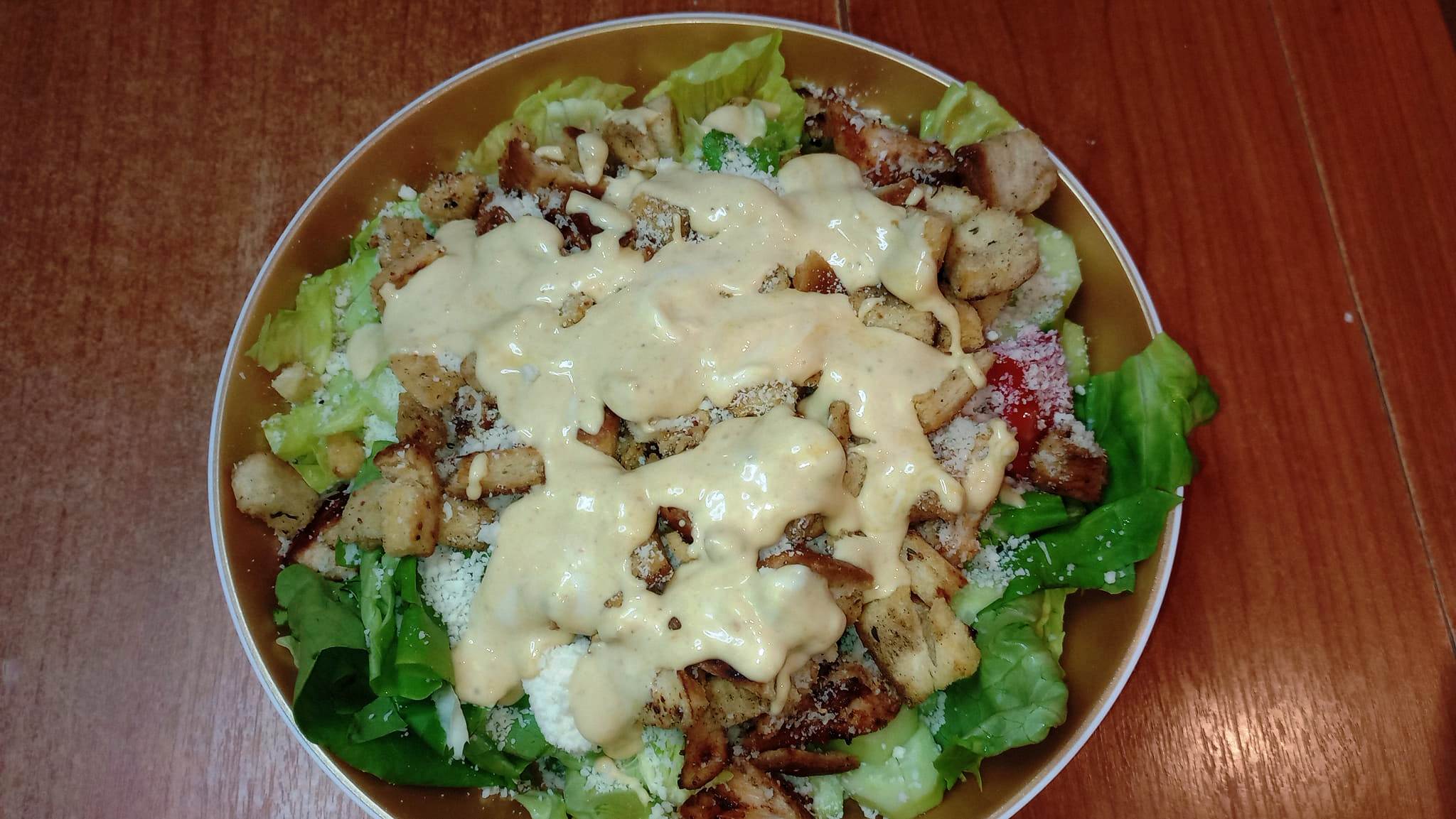 Σως: Η κλασική σως Καίσαρα, με βάση το ελαιόλαδο, λεμόνι, σκόρδο, μουστάρδα και Worcestershire sauce, δένει τα υλικά μαζί και απογειώνει τη γεύση της σαλάτας.