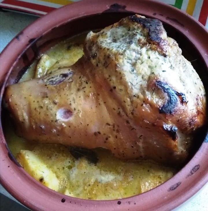 Αυτό το πιάτο είναι ό,τι πρέπει για μια Κυριακάτικη συνάντηση με την οικογένεια ή τους φίλους. Το χοιρινό κότσι γίνεται λουκούμι, οι πατάτες απορροφούν τα υγρά και τα μυρωδικά δίνουν μια υπέροχη φρεσκάδα.