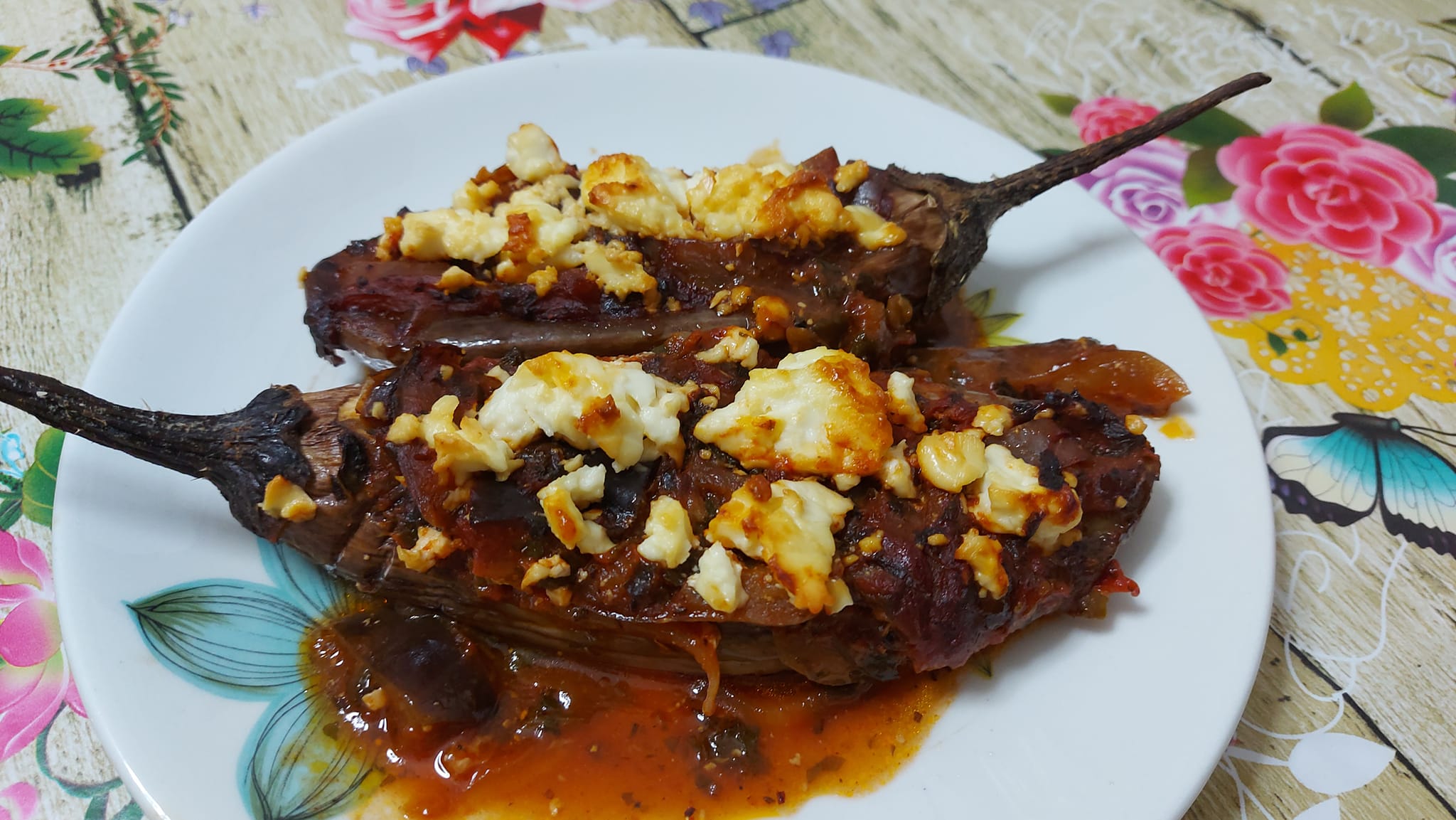 Όταν έγινε, γεμισα τα σκαφακια της μελιτζάνας, πρόσθεσα φέτα και ροδέλες φρέσκιας ντομάτας και δύο πατάτες τις εκοψα σε κομμάτια και τις έριξα στο ταψί γιατί τις είχα απεθυμησει.