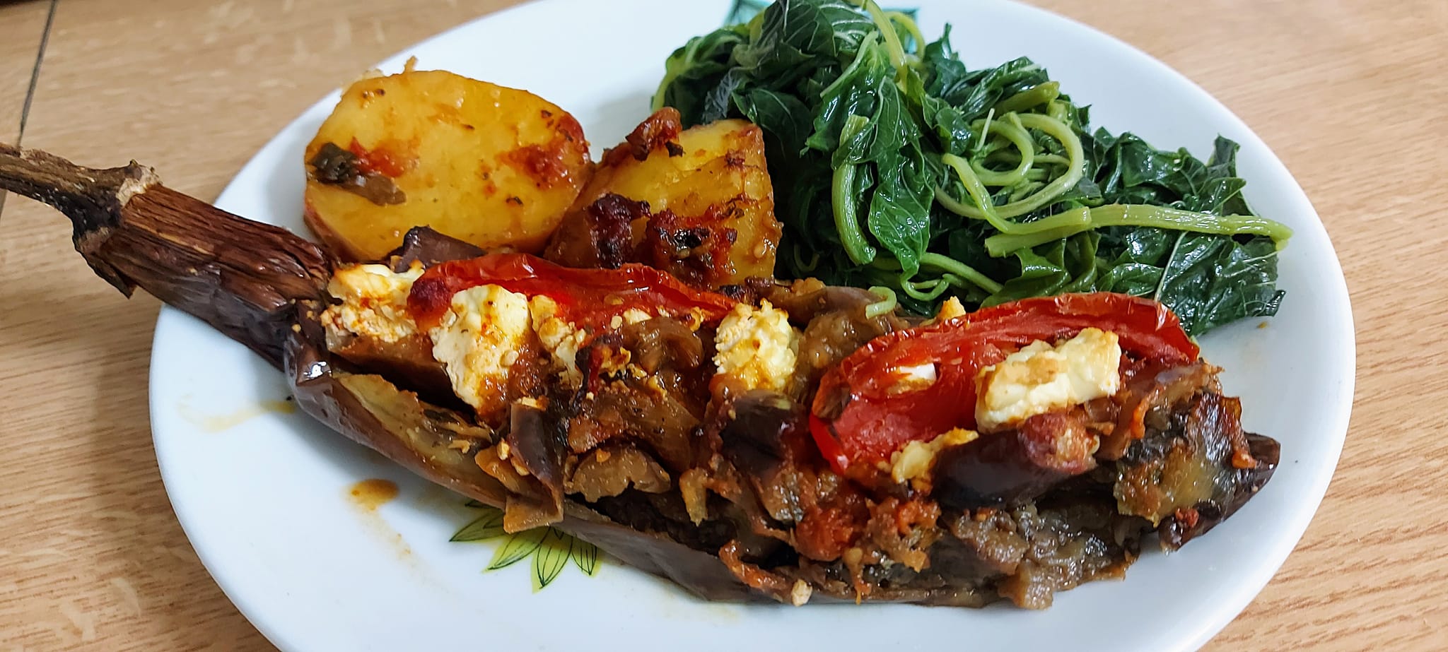 Όταν έγινε, γεμισα τα σκαφακια της μελιτζάνας, πρόσθεσα φέτα και ροδέλες φρέσκιας ντομάτας και δύο πατάτες τις εκοψα σε κομμάτια και τις έριξα στο ταψί γιατί τις είχα απεθυμησει.