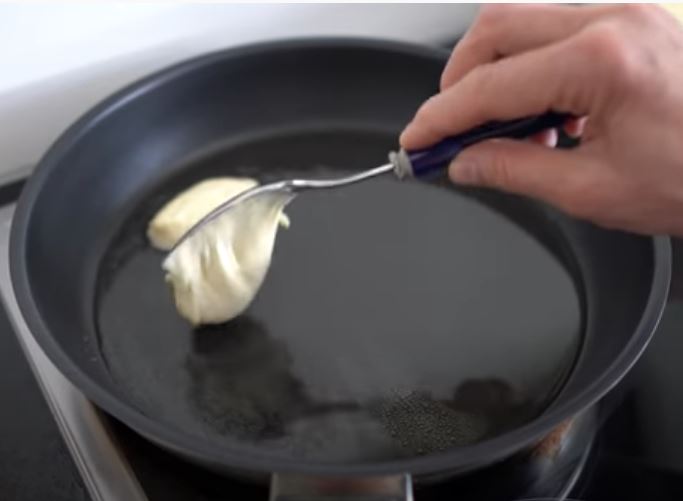 Μόλις ζεσταθεί το λάδι και λιώσει η μαργαρίνη παίρνουμε μία κουτάλια από την ζύμη και ρίχνουμε στο τηγάνι.