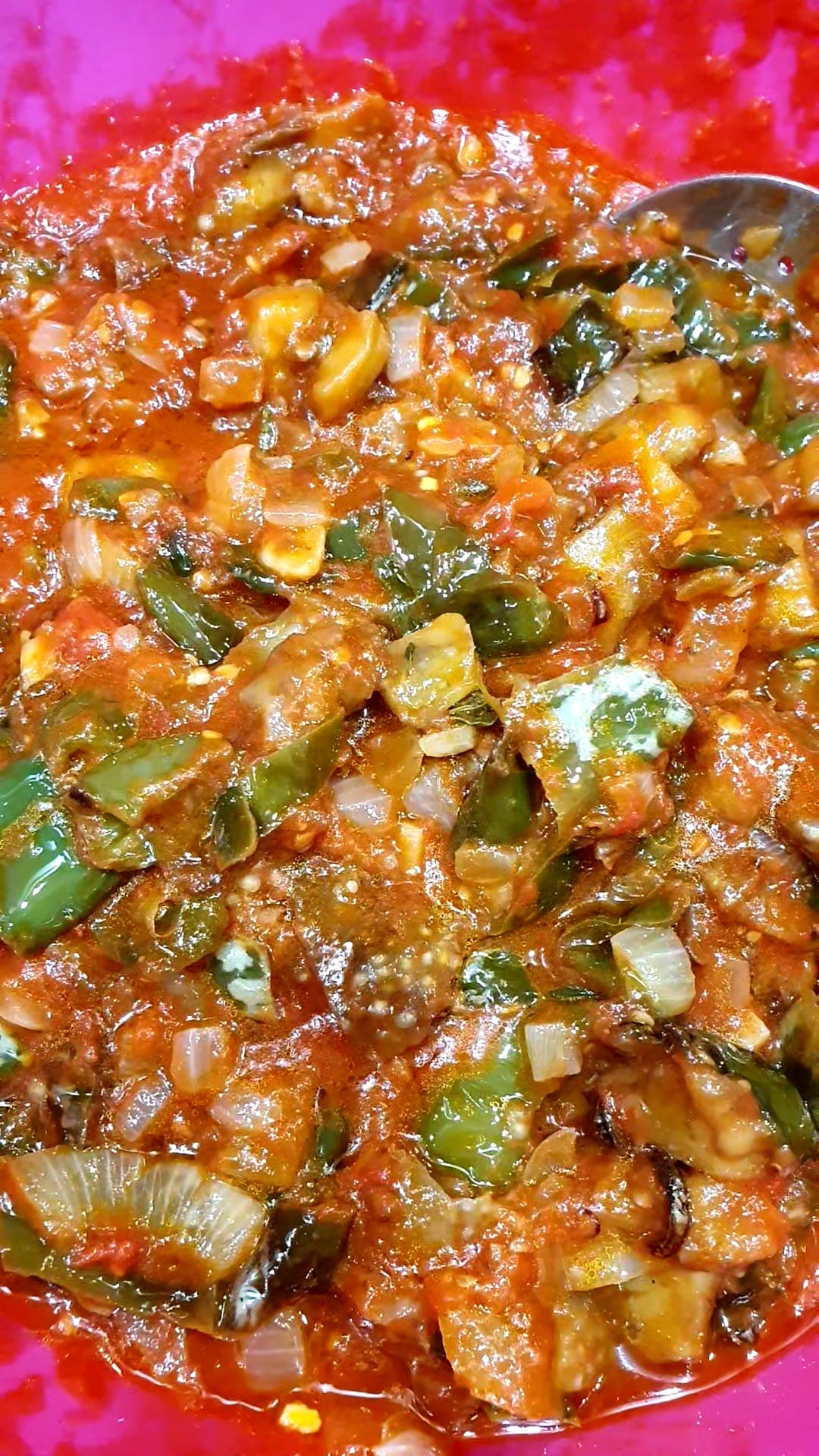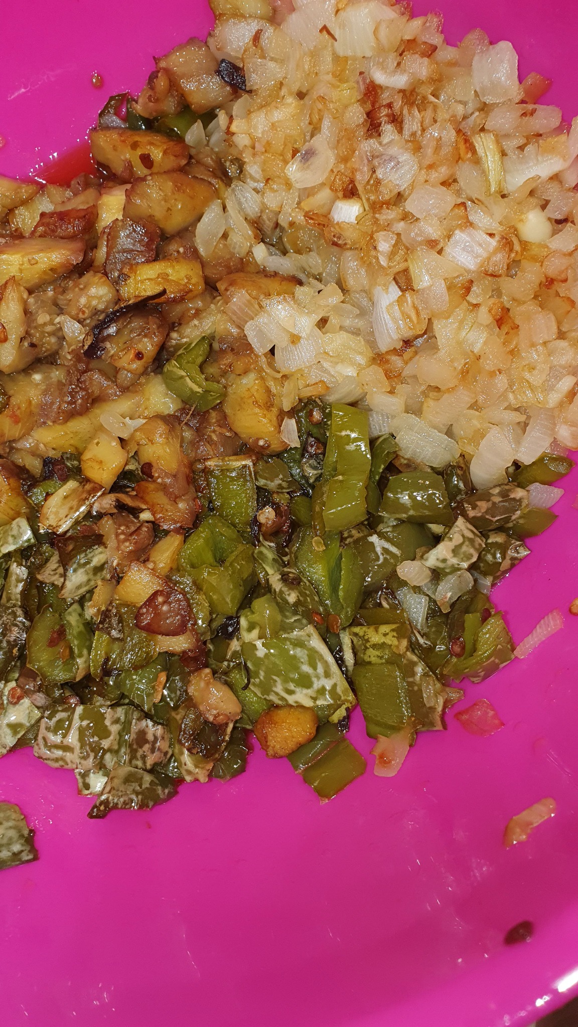 Τηγανίζουμε τις πιπεριές, το εσωτερικό των μελιτζάνων και τα υπόλοιπα λαχανικά ένα-ένα, στο ίδιο λάδι (αλάτι για γεύση)…