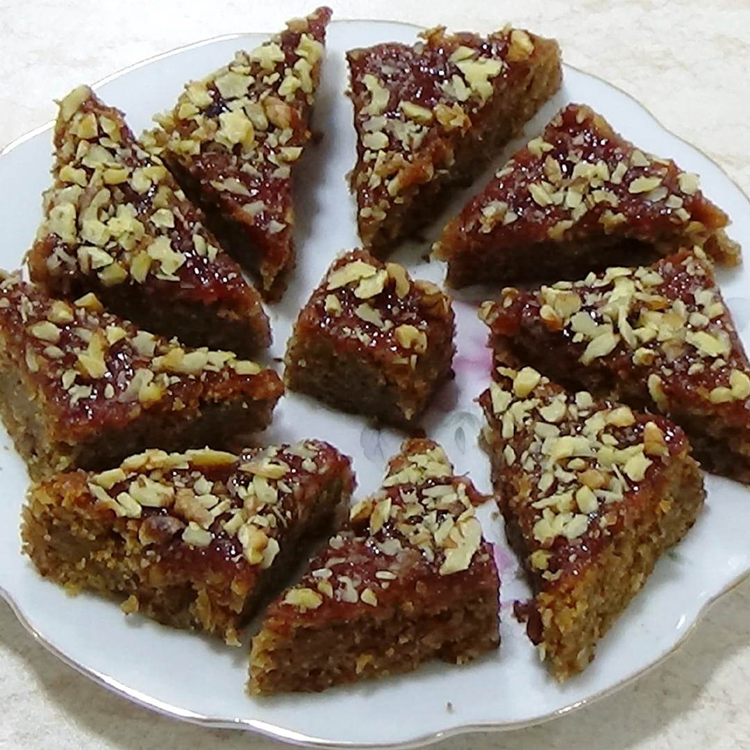 Βγάλτε απο το φύρνο και το γαρνιρουμε το κέικ ενώ είναι ζεστό, αλειφουμε με μαρμελάδα και πασπαλίζουμε με καρύδια