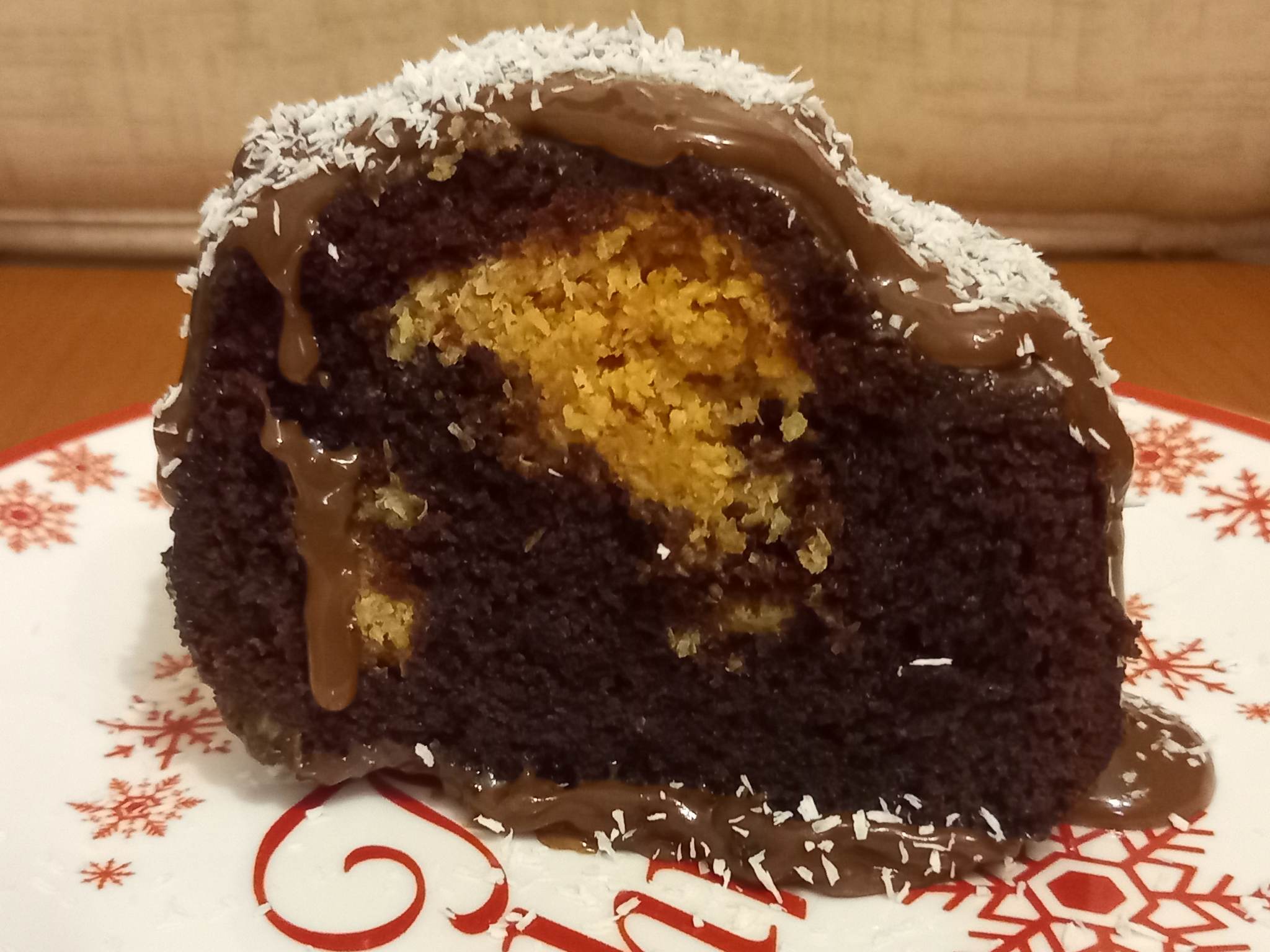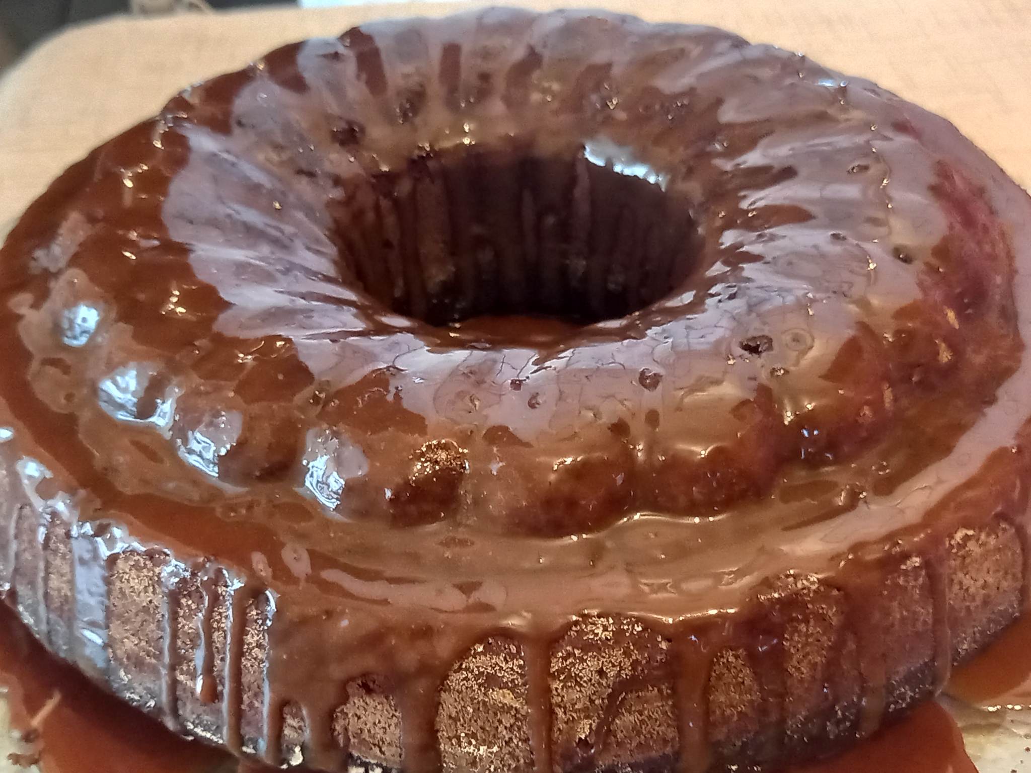 Ψήνουμε σε προθερμασμένο φούρνο στους 180 βαθμούς για 30 με 35 λεπτά. Ξεφορμάρουμε το κέικ και το καλύπτουμε με την γκανάζ σοκολάτας.