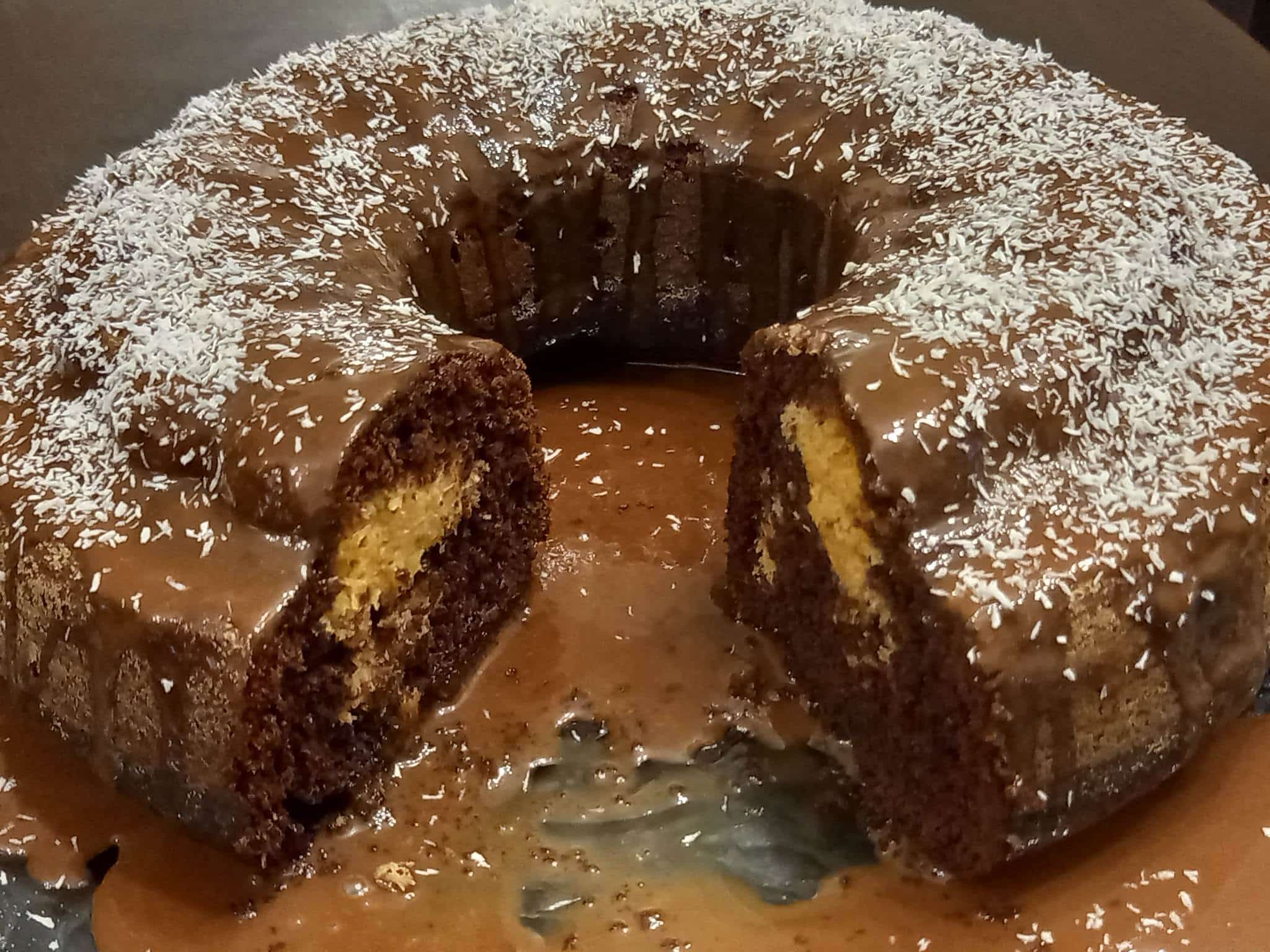 Χτυπάμε για άλλα 2-3 λεπτά. Αδειάζουμε λίγο παραπάνω από το μισό μείγμα σε μία βουτυρωμένη και αλευρωμένη φόρμα κέικ. Μοιράζουμε κουταλιά-κουταλιά το μείγμα του ζαχαρούχου με την καρύδα.
