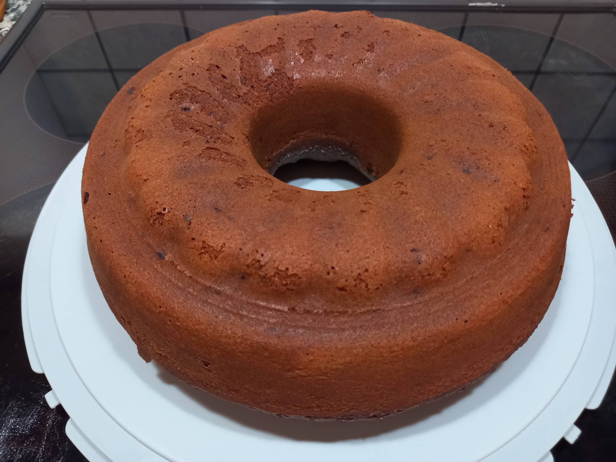 Αδειάζουμε το μείγμα του κέικ σε μία πολύ καλά βουτυρωμένη και αλευρωμένη φόρμα και ψήνουμε σε προθερμασμένο φούρνο στους 180 βαθμούς Κελσίου για μία ώρα περίπου.