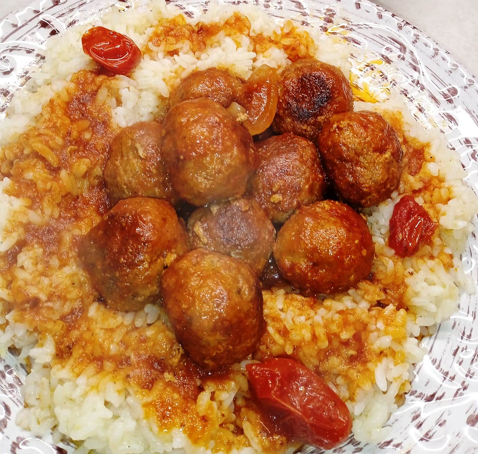 Kεφτεδάκια με σάλτσα και ρυζάκι φούρνου.