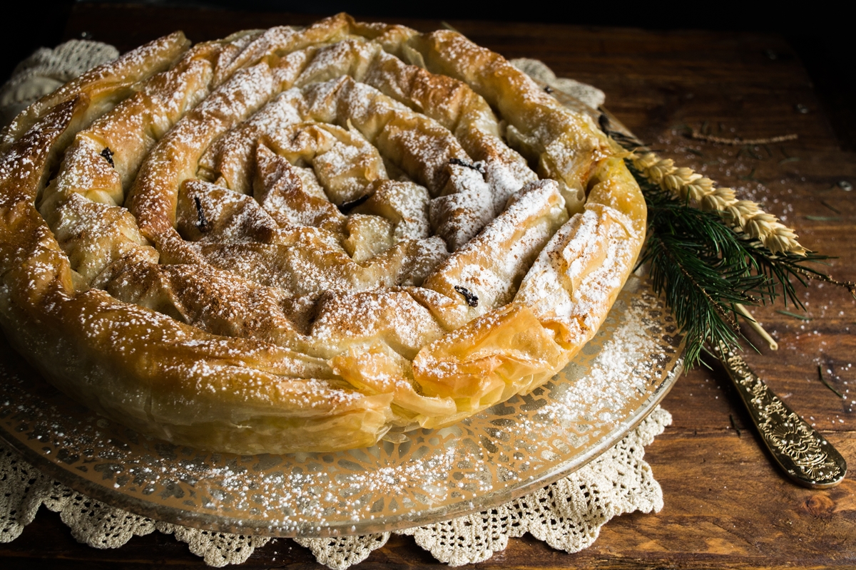 Απλώνετε το μεγαλύτερο φύλλο σε λαδωμένο ταψί με διάμετρο 26 εκ. ώστε να καλυφθούν και τα πλαϊνά του ταψιού. Το αλείφετε με λάδι και ρίχνετε από πάνω τη γέμιση. Τη σκεπάζετε με το δεύτερο φύλλο και με τη ζύμη που εξέχει σχηματίζετε ένα ζυμαρένιο στεφάνι, τον κόθρο. Χαράζετε την πίτα σε κομμάτια και αλείφετε την επιφάνεια με λάδι.