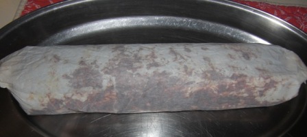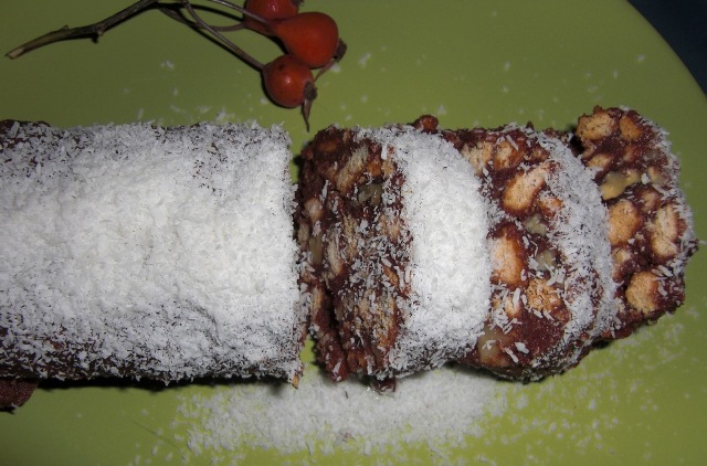 Προσθέτουμε τα μπισκότα και τα καρύδια συνεχίζοντας το ανακάτεμα να ενσωματωθούν τα υλικά. Βάζουμε ένα μεγάλο κομμάτι λαδόκολλα πάνω στον πάγκο της κουζίνας, απλώνουμε πάνω του το μείγμα και σχηματίζουμε με τη βοήθεια της λαδόκολλας ένα ρολό.