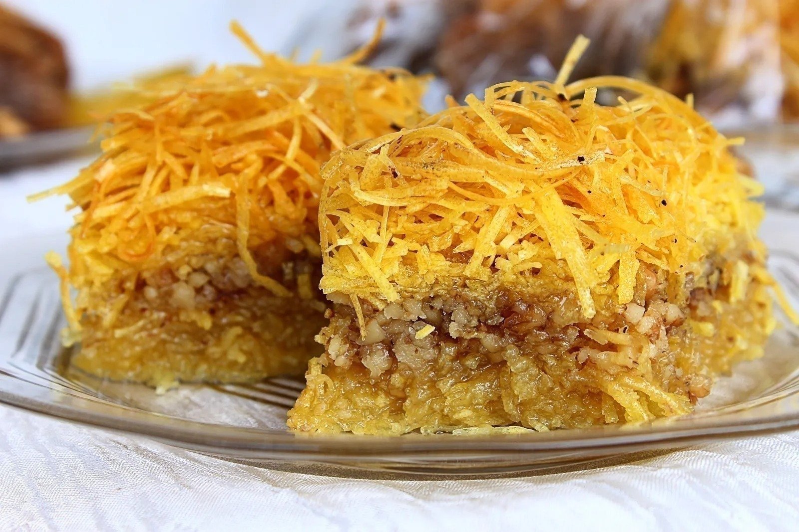 Ξεπαγώστε το κανταΐφι. Απλώστε το μισό καταΐφι στο ταψί και στρώστε τα αμύγδαλα και τα καρύδια.