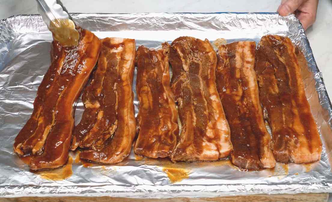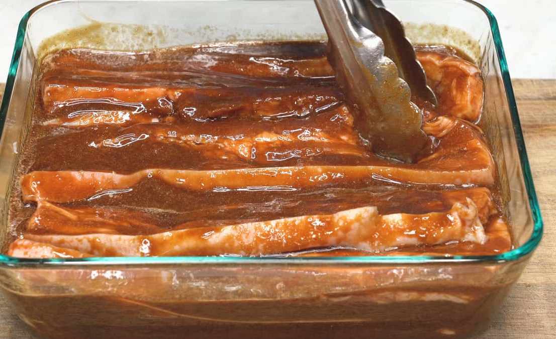Μαρινάρετε 2 κιλά χοιρινή πανσέτα κομμένη σε φέτες και βάζετε στο ψυγείο για 4 έως 8 ώρες.