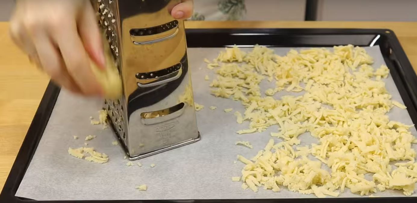 Τρίβω τη παγωμένη ζύμη σε χοντρό τρίφτη αμέσως σε ένα ταψί στρωμένο με λαδόκολα και την απλώνω ομοιόμορφα σε όλο το ταψί σε μια λεπτή στρώση