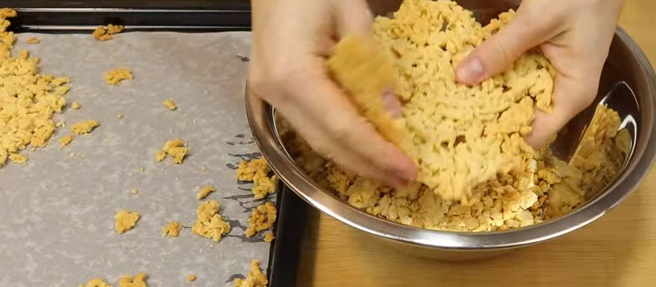 Ψήνω 180° την ζυμη 25 λεπτά αφήνω να κρυώσει τελείως και με τα χέρια μου τριβω την ζυμη σε μπολ όχι πολύ ψιλά.