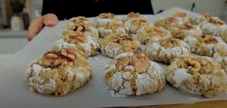 Μόνο καρύδια, ασπράδι αυγού και ζάχαρη… την οποία μείωσα στο μισό (ως συνήθως), αλλά είναι εξίσου γλυκά χωρίς υπερβολή, επίσης επειδή στη συνέχεια τα βουτάμε σε ζάχαρη άχνη!